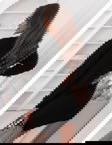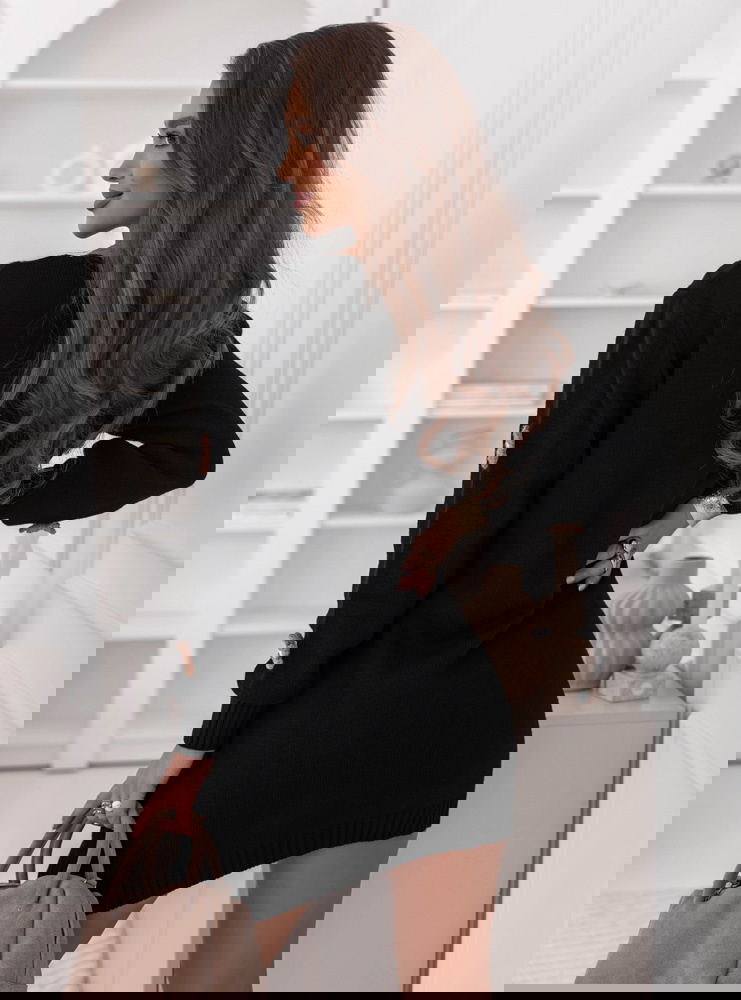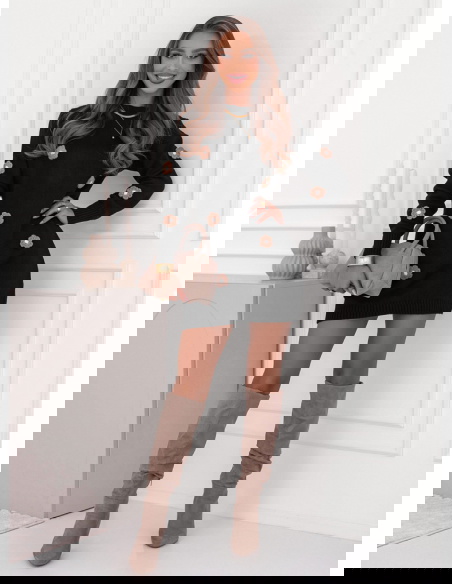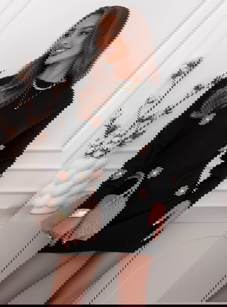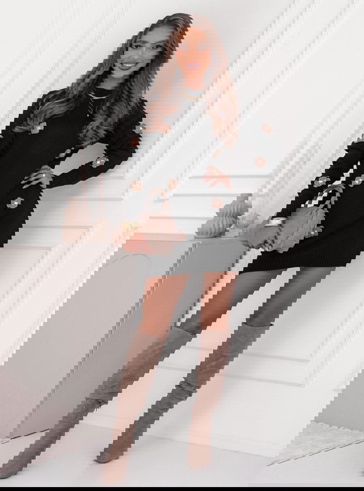 Czarna swetrowa sukienka z ozdobnymi kwiatkami Gotzonee doskonale sprawdzi się na co dzień – do pracy, na spotkanie czy spacer po mieście. W połączeniu z długimi kozakami i płaszczem stworzy elegancki, jesienny zestaw.