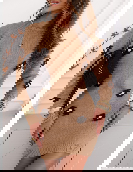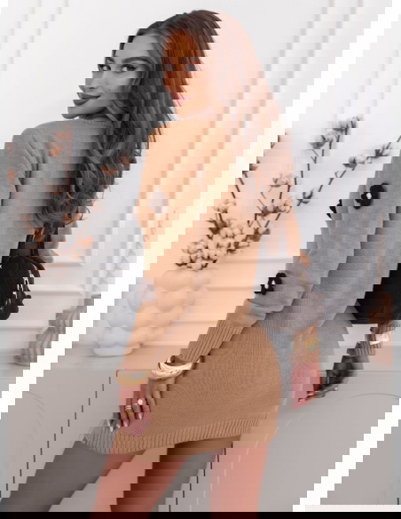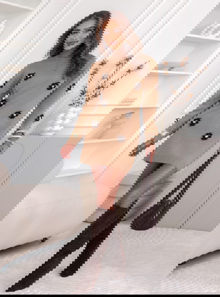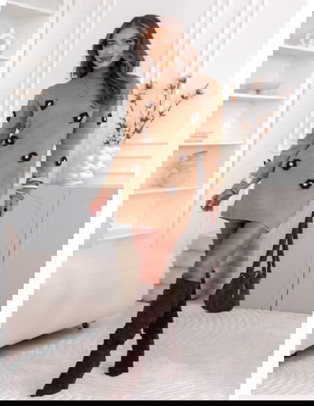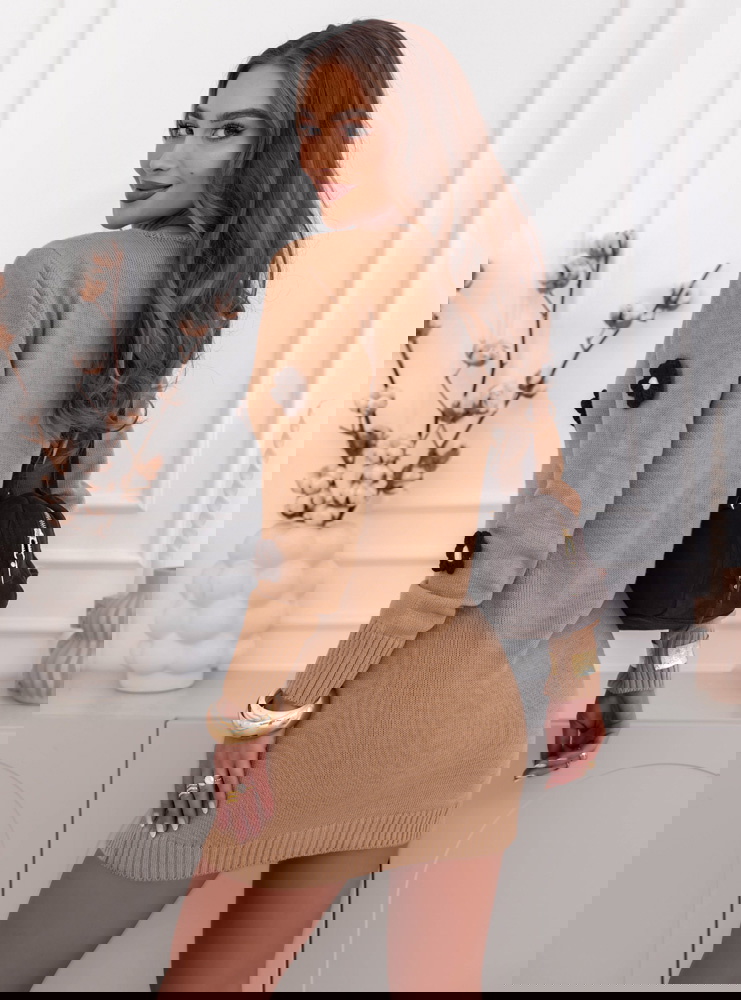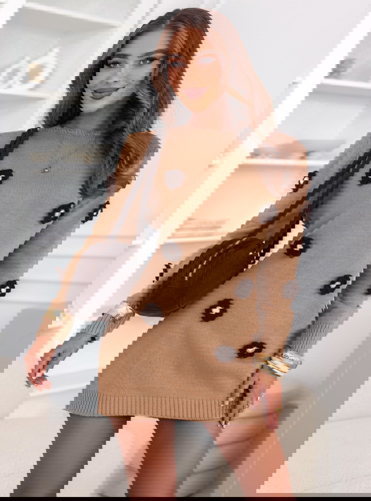 Swetrowa sukienka z ozdobnymi kwiatkami Gotzonee - mocha mousse to idealne połączenie ciepła, wygody i kobiecego uroku. Jej przytulny wygląd od razu wprowadza w jesienny nastrój, a subtelne detale dodają jej wyjątkowego charakteru. Ciepły odcień beżu z nutą brązu pięknie podkreśla urodę i doskonale komponuje się z jesiennymi dodatkami. Ozdobne kwiatki rozmieszczone na całej powierzchni sukienki nadają jej dziewczęcego wdzięku i modowego akcentu. To model, który zachwyca prostotą, a jednocześnie przyciąga wzrok oryginalnym detalem. Luźniejszy krój zapewnia komfort i swobodę ruchów, jednocześnie delikatnie podkreślając figurę. Sukienka prezentuje się stylowo zarówno solo, jak i w zestawie z botkami czy długimi kozakami. To idealna propozycja dla kobiet, które cenią modę w naturalnym, przytulnym wydaniu. Mocha mousse to odcień, który dodaje elegancji i ciepła każdej stylizacji.