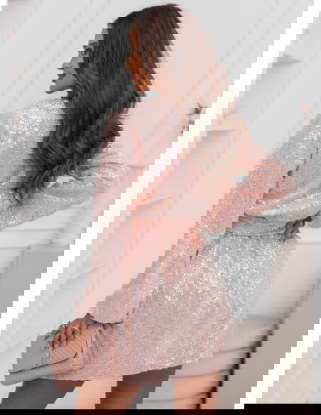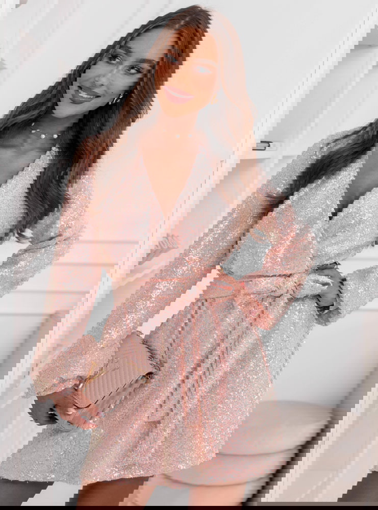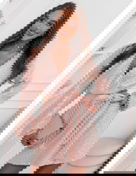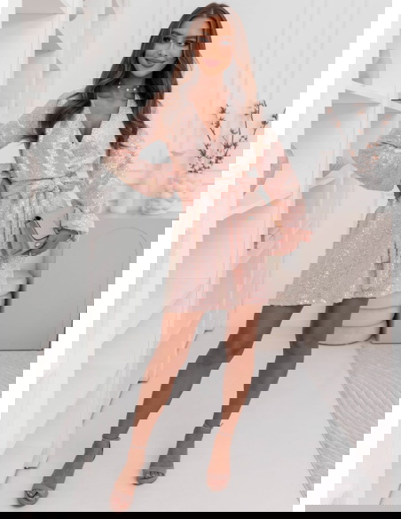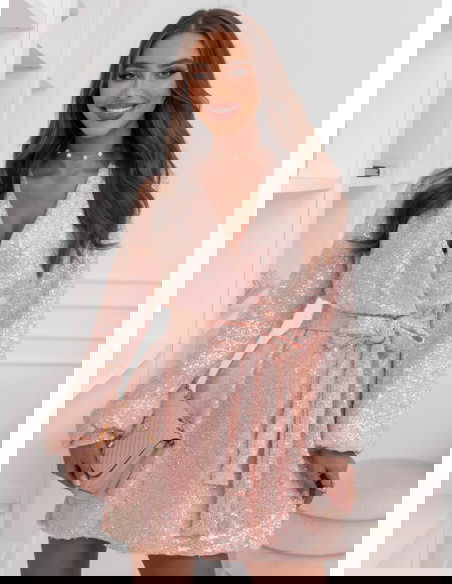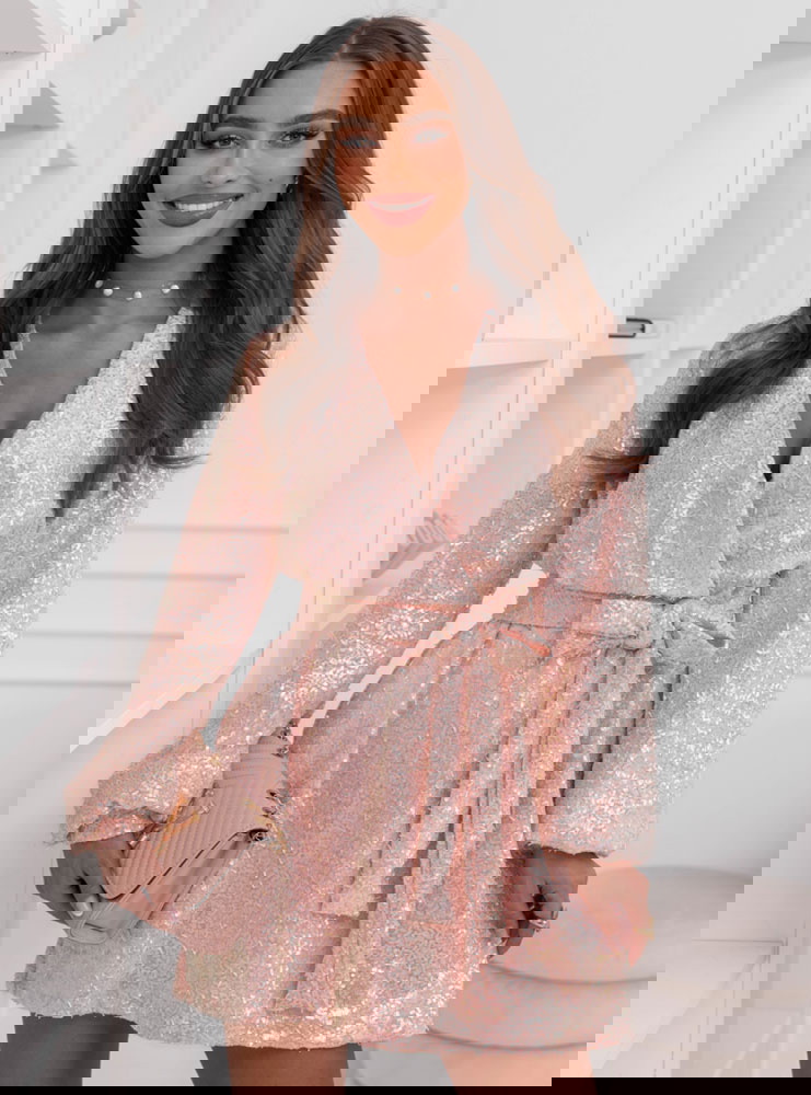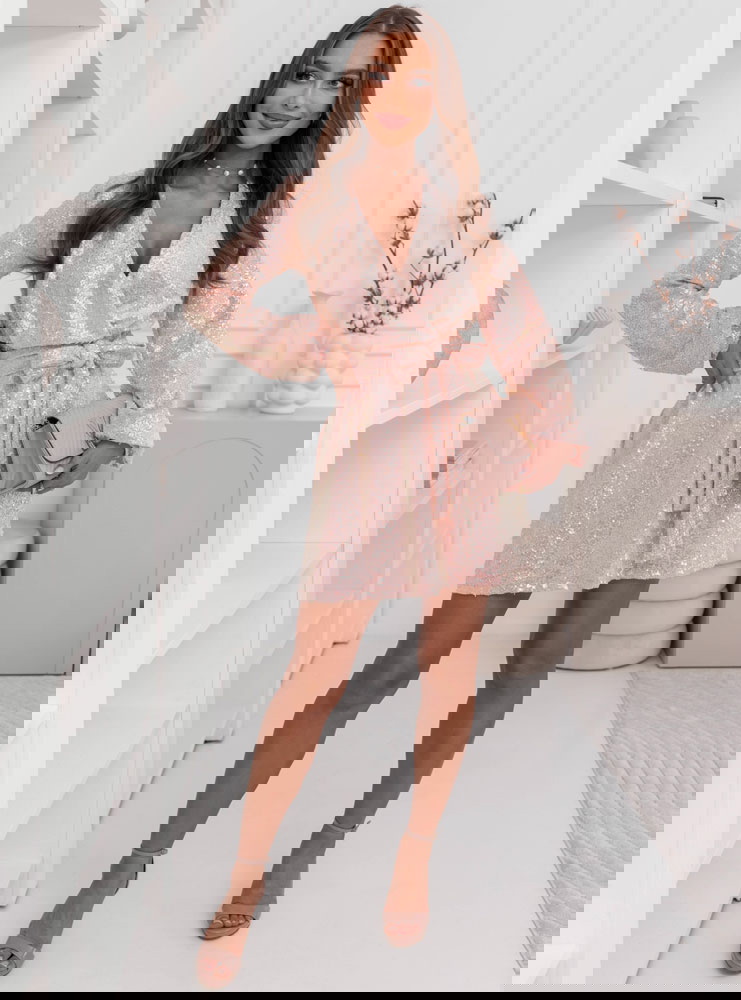 Pudrowa cekinowa sukienka z przekładanym dekoltem Castorie to idealny wybór na uroczystości, przyjęcia, randki czy wieczorne spotkania. Sprawdzi się także podczas świąt, wesel, urodzin lub sylwestrowych imprez.