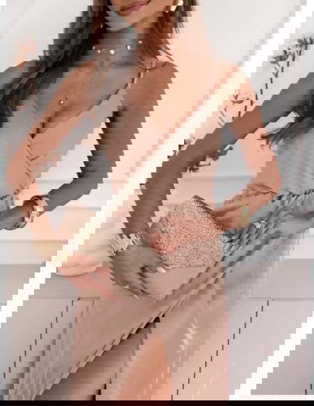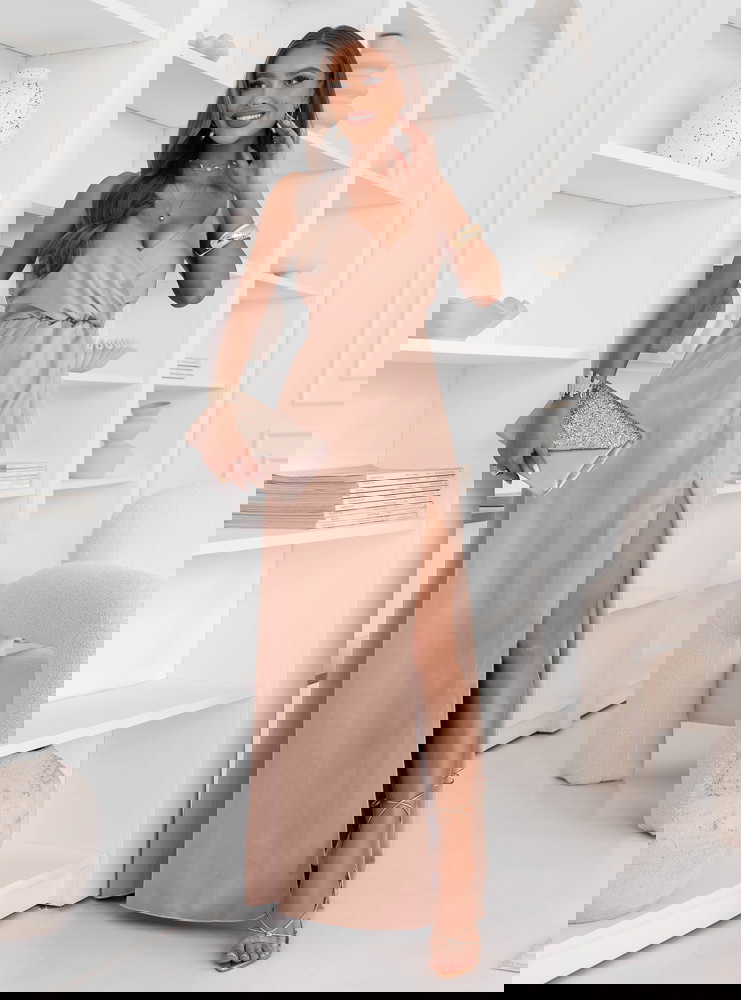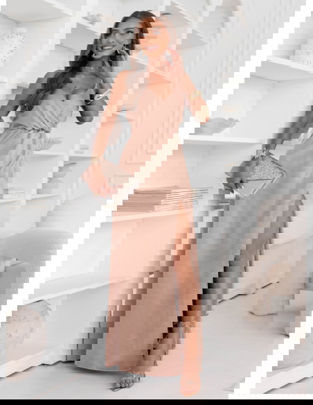 Beżowa sukienka satynowa maxi na ramiączkach Ayalisse