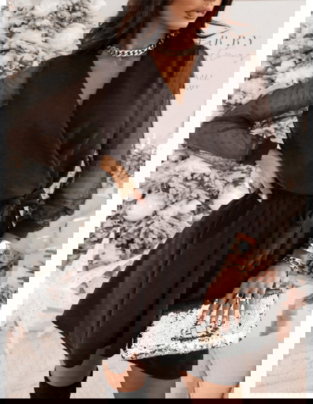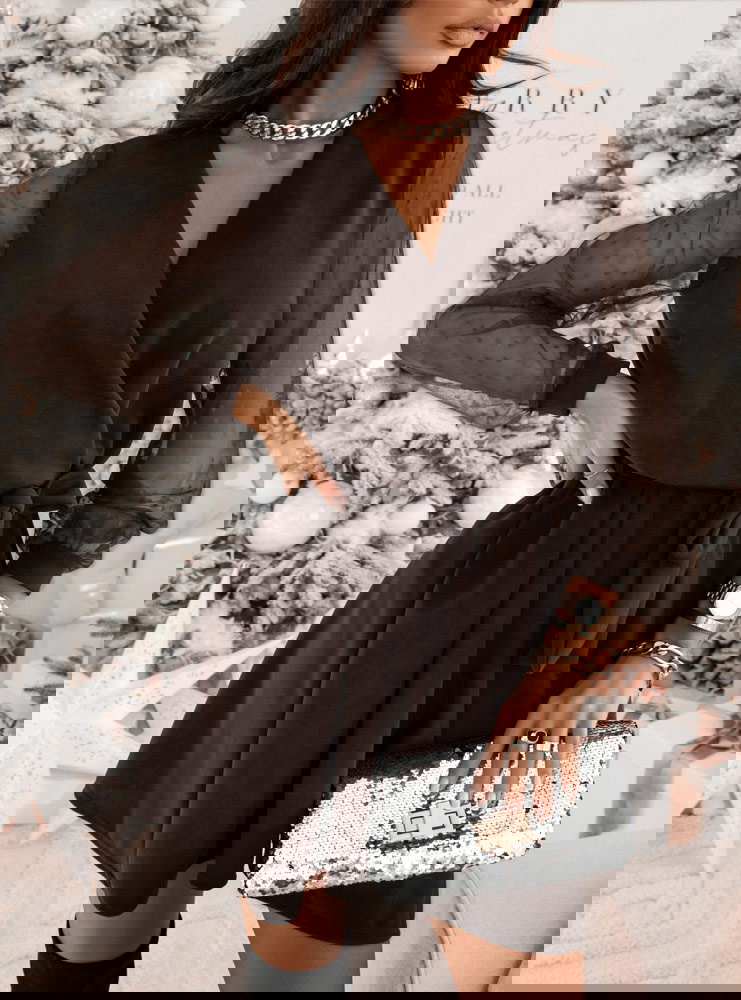 Czekoladowa sukienka z przekładanym dekoltem i tiulowymi rękawami Shandiina