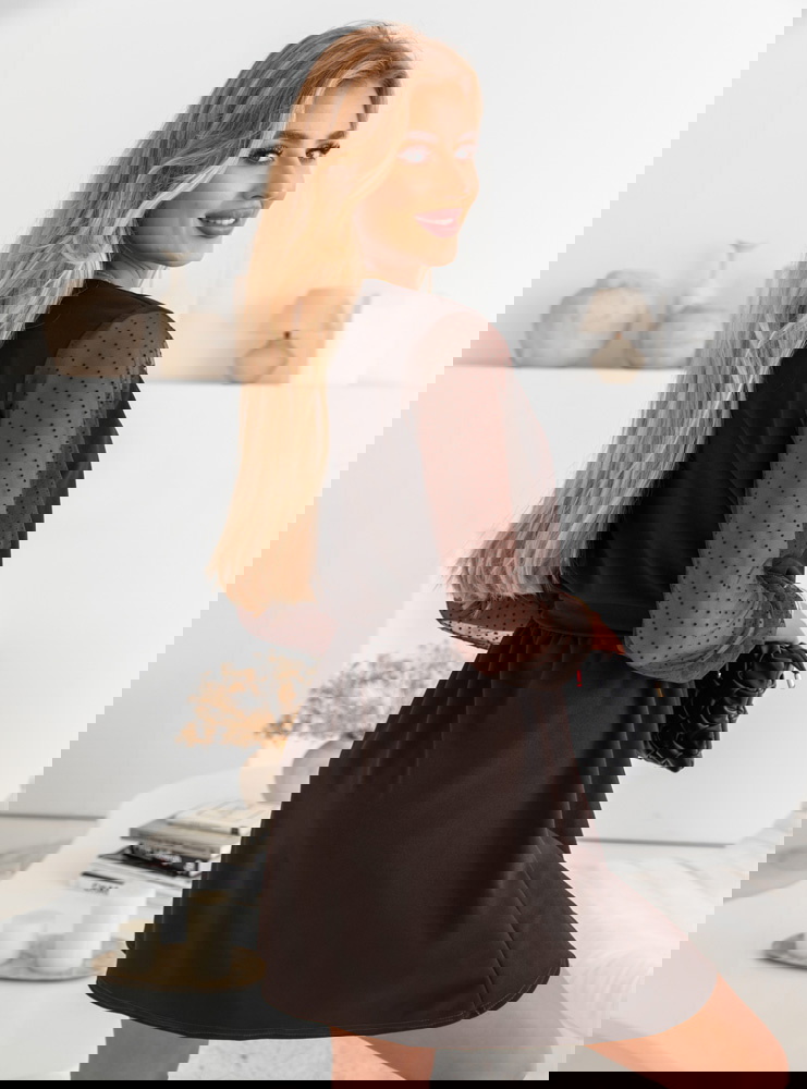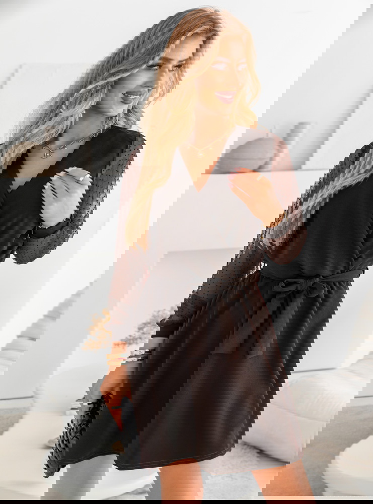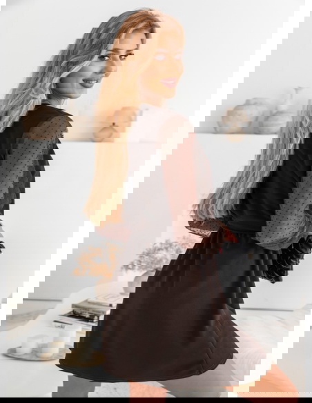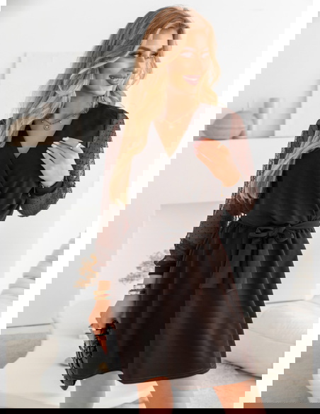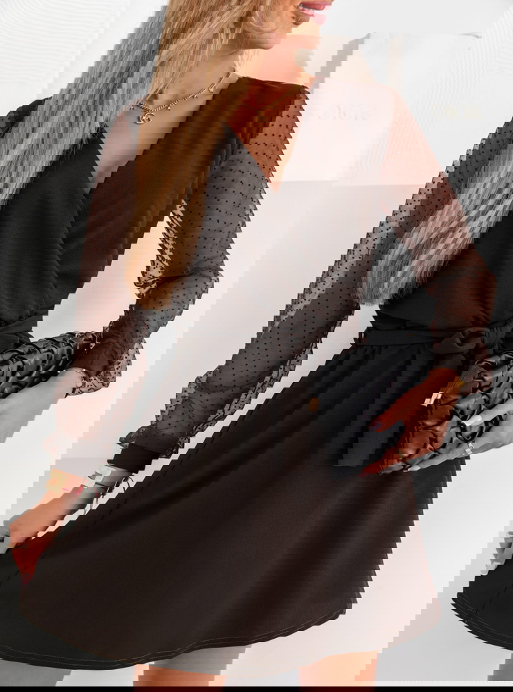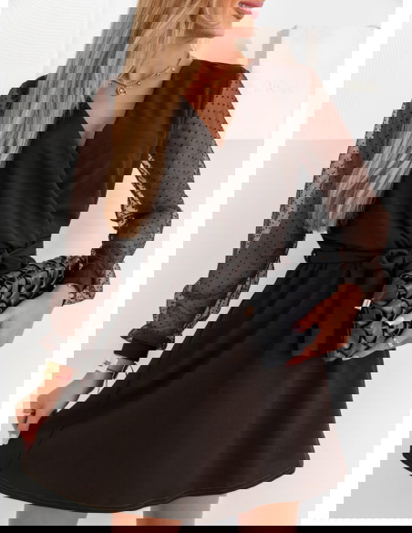 Czekoladowa sukienka z przekładanym dekoltem i tiulowymi rękawami Mertysa