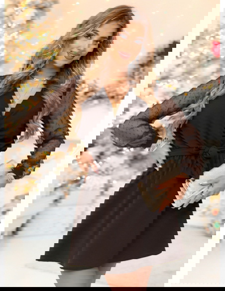 Czekoladowa sukienka z przekładanym dekoltem i tiulowymi rękawami Launna to połączenie klasy, kobiecości i subtelnej elegancji w jesiennym wydaniu. Delikatne tiulowe rękawy nadają jej lekkości, a przekładany krój pięknie podkreśla sylwetkę.