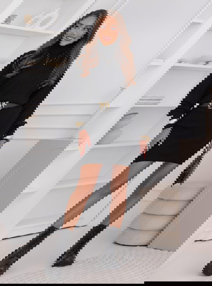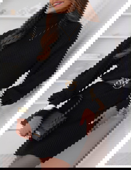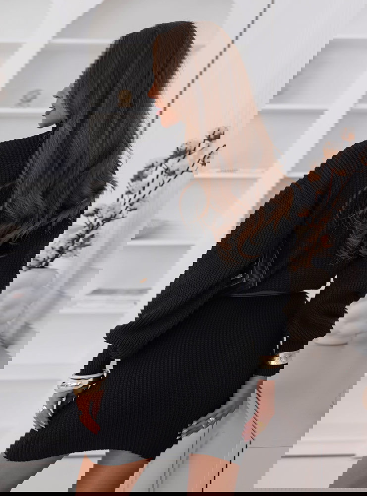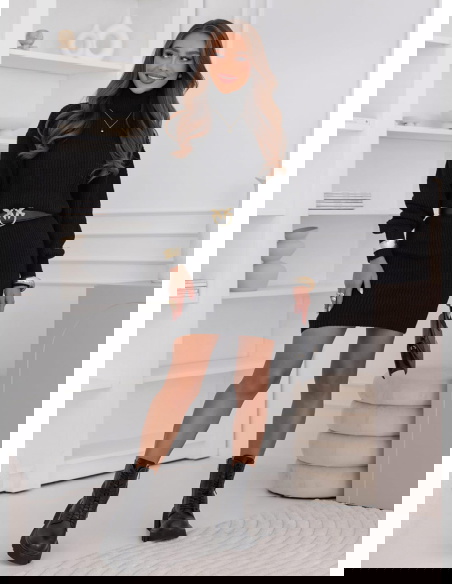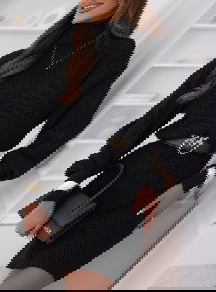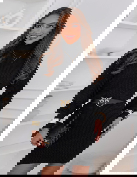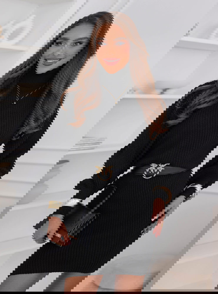 Czarna swetrowa sukienka z golfem Evilia to klasyka, która nigdy nie wychodzi z mody. Jej prosty, a jednocześnie kobiecy fason sprawia, że wygląda niezwykle elegancko, a przy tym pozostaje wygodna i praktyczna. Czerń nadaje jej uniwersalnego charakteru – idealnie wpisuje się w jesienno-zimowe stylizacje. Golf pięknie otula szyję, dodając całości ciepła i wyrafinowanego wyglądu. Luźniejsza góra w połączeniu z dopasowanym dołem tworzy harmonijny efekt, który podkreśla sylwetkę w subtelny sposób. Sukienka prezentuje się wyjątkowo zarówno w codziennych zestawach, jak i bardziej eleganckich odsłonach. To model, który świetnie wygląda z paskiem, ale także sam w sobie tworzy kompletny, stylowy look. Dzięki swojej prostocie daje wiele możliwości – można ją nosić z kozakami, botkami, a nawet trampkami. Jest ponadczasowa, kobieca i niezwykle stylowa – idealna na chłodniejsze dni. W tej sukience poczujesz się modnie, pewnie i wyjątkowo o każdej porze dnia.