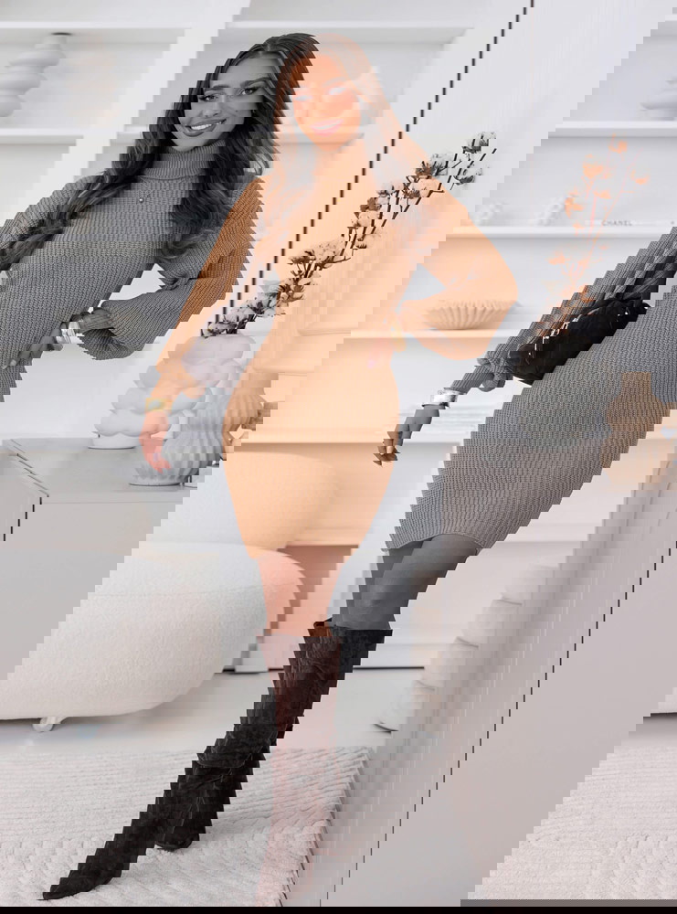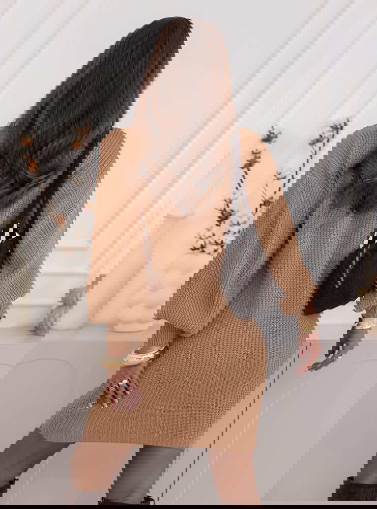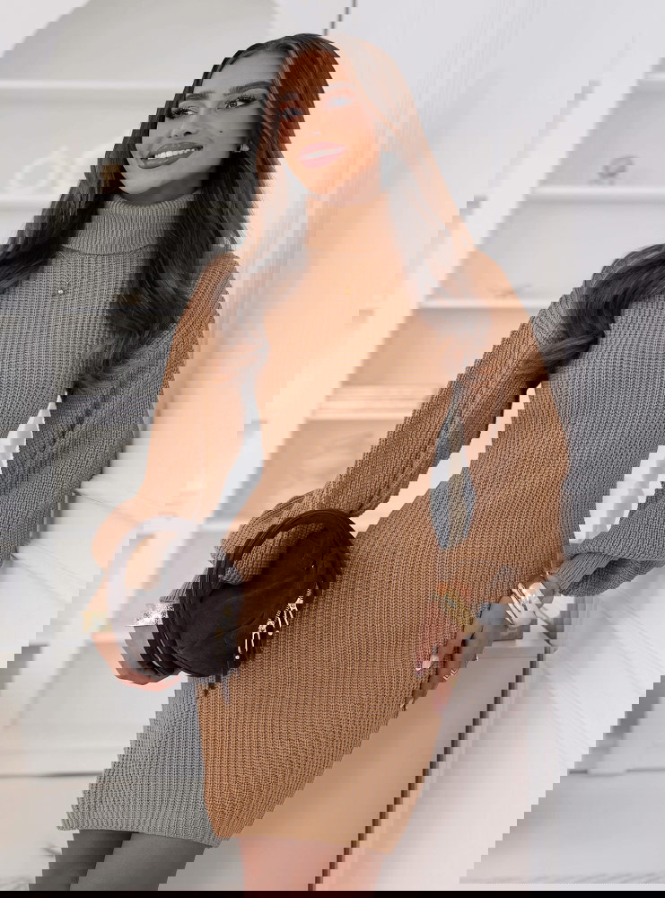 Swetrowa sukienka z golfem Evilia - mocha mousse to połączenie elegancji, kobiecości i wygody w najlepszym wydaniu. Jej ciepły kolor wprowadza do stylizacji przytulny klimat, idealny na chłodniejsze dni.