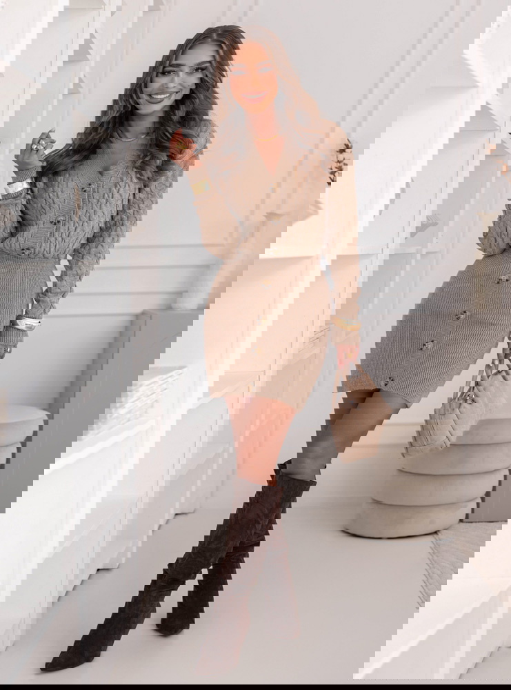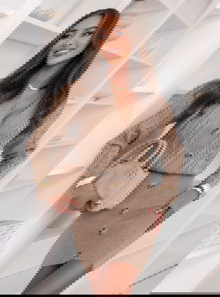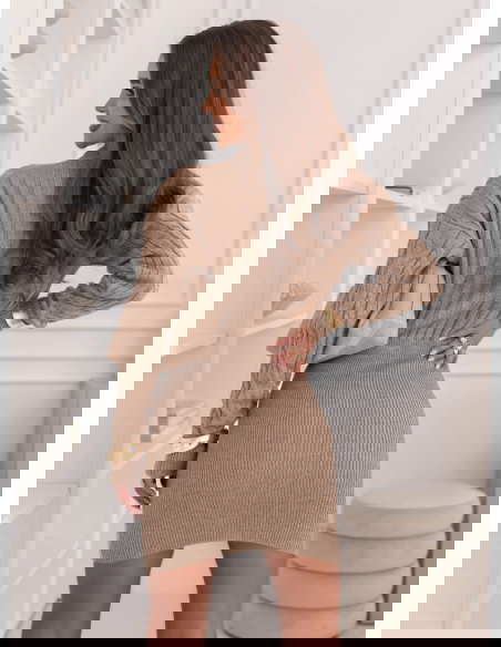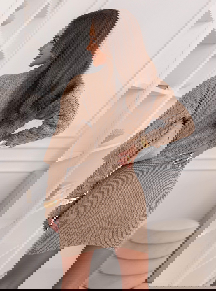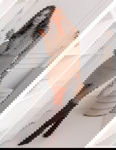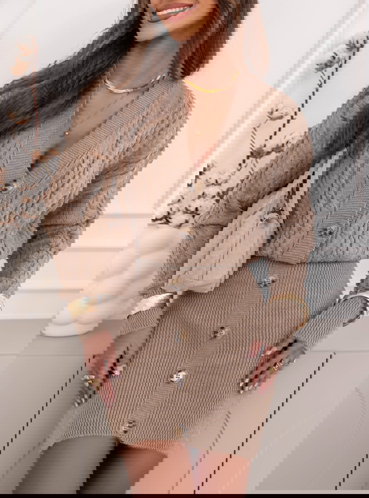 Swetrowa sukienka z guzikami Fenneke - mocha mousse to połączenie kobiecej elegancji i jesiennego ciepła w najmodniejszym wydaniu. Jej odcień mocha doskonale współgra z naturalnymi barwami sezonu, tworząc harmonijną i przytulną stylizację. To model, który przyciąga uwagę subtelnymi detalami i idealnym dopasowaniem do sylwetki. Delikatny splot nadaje jej wyjątkowego charakteru, a guziki z przodu dodają uroku i stylowego wykończenia. Góra zapinana na guziki tworzy piękny dekolt w serek, który podkreśla kobiecość i nadaje całości lekkości. To sukienka, która łączy klasykę z nowoczesnym designem – idealna na każdą okazję. Z łatwością dopasujesz ją do różnych stylów – od codziennego po elegancki. Dzięki swojemu fasonowi podkreśla figurę, jednocześnie zapewniając pełen komfort noszenia. To idealny wybór dla kobiet, które lubią wyglądać modnie, ale cenią sobie swobodę. W niej każda chwila nabiera stylowego blasku.