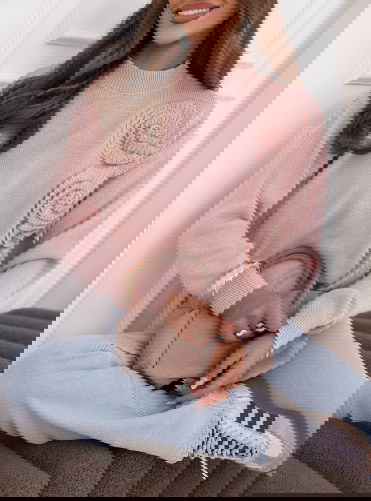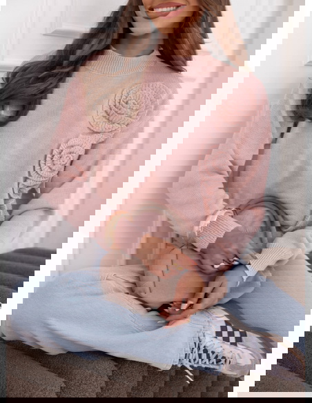 Pudrowy sweter z ozdobnymi kwiatami Leahcim