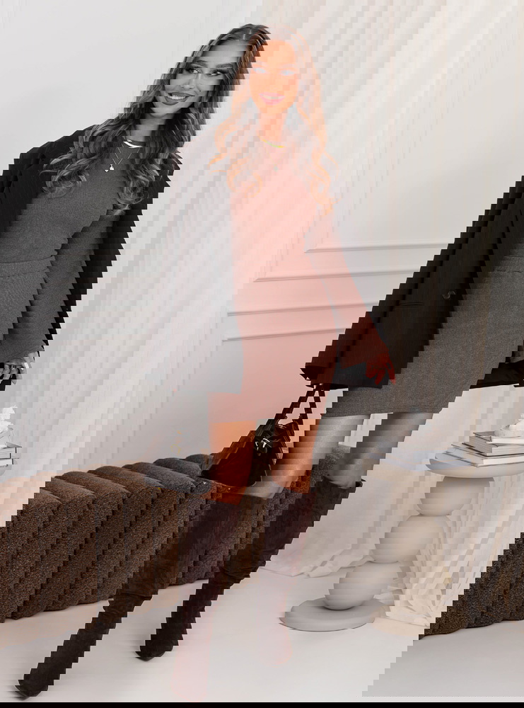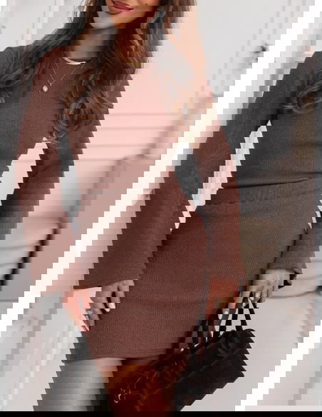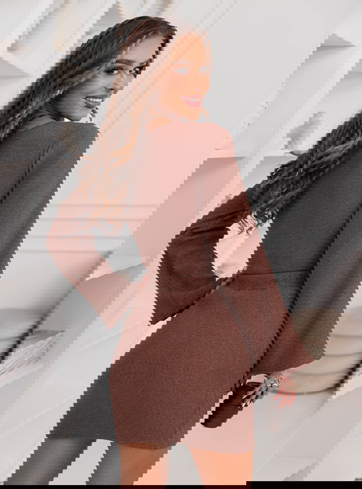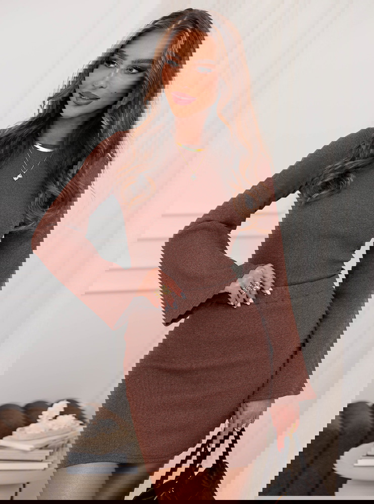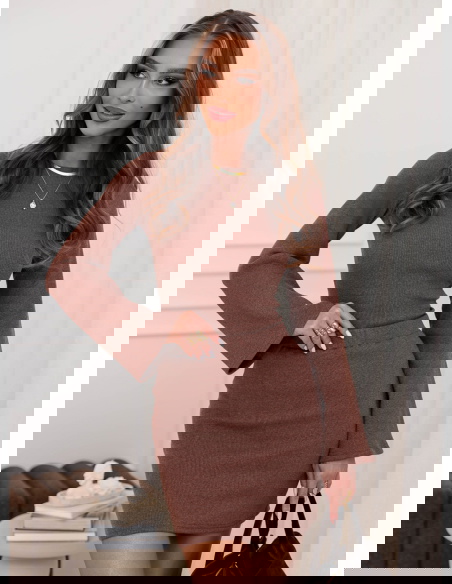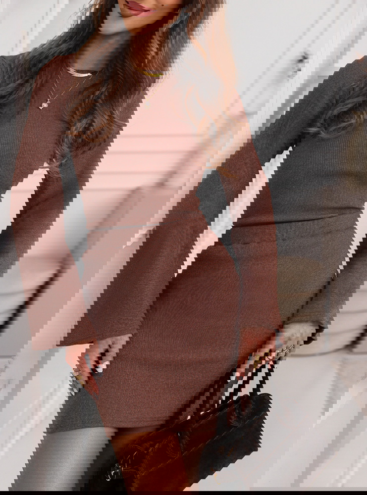 Prążkowany komplet bluzka i spódniczka Jennyver - mocha mousse to idealne połączenie kobiecego stylu i codziennego komfortu. Jego ciepły, czekoladowo–mocha odcień wprowadza do stylizacji elegancję w jesiennym wydaniu. To zestaw, który zachwyca prostotą i dopracowanymi detalami, tworząc spójną, modną całość. Dopasowana forma pięknie podkreśla sylwetkę, jednocześnie pozostając subtelna i z klasą. Długie rękawy i prążkowana struktura nadają całości przytulnego, ale nowoczesnego charakteru. To komplet, który można nosić razem lub osobno, tworząc wiele różnych stylizacji. Idealnie sprawdzi się zarówno w miejskich lookach, jak i bardziej eleganckich zestawach. Minimalistyczny krój sprawia, że jest uniwersalny i ponadczasowy. Każdy element został zaprojektowany tak, by podkreślać kobiecość w sposób naturalny i niewymuszony. To propozycja dla kobiet, które lubią wyglądać stylowo, ale czuć się przy tym swobodnie.