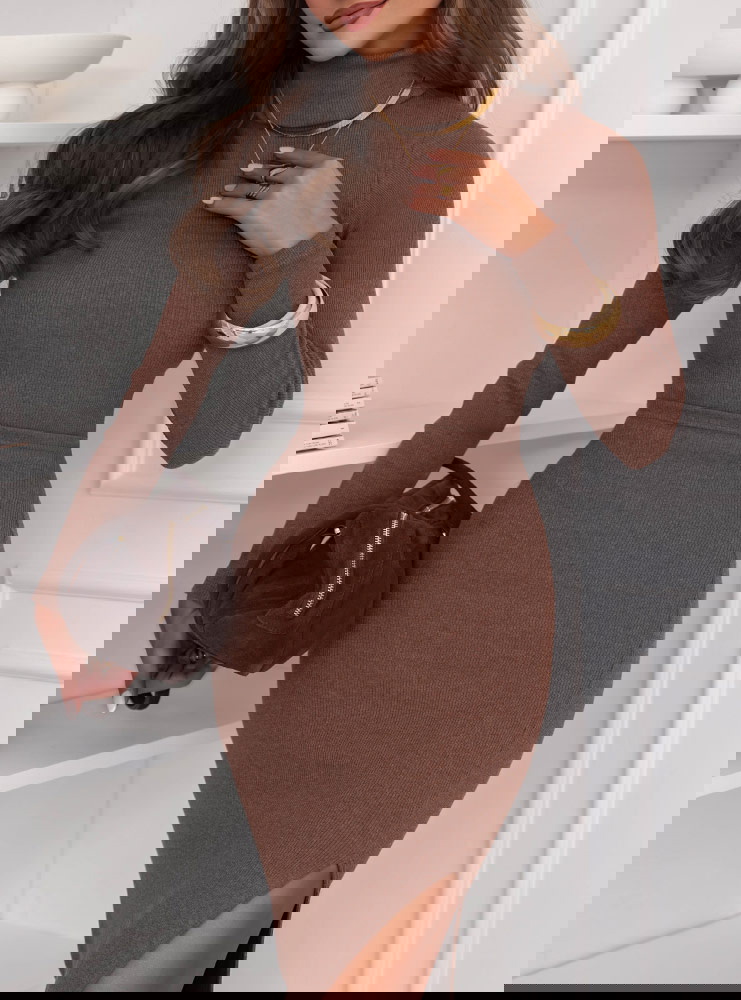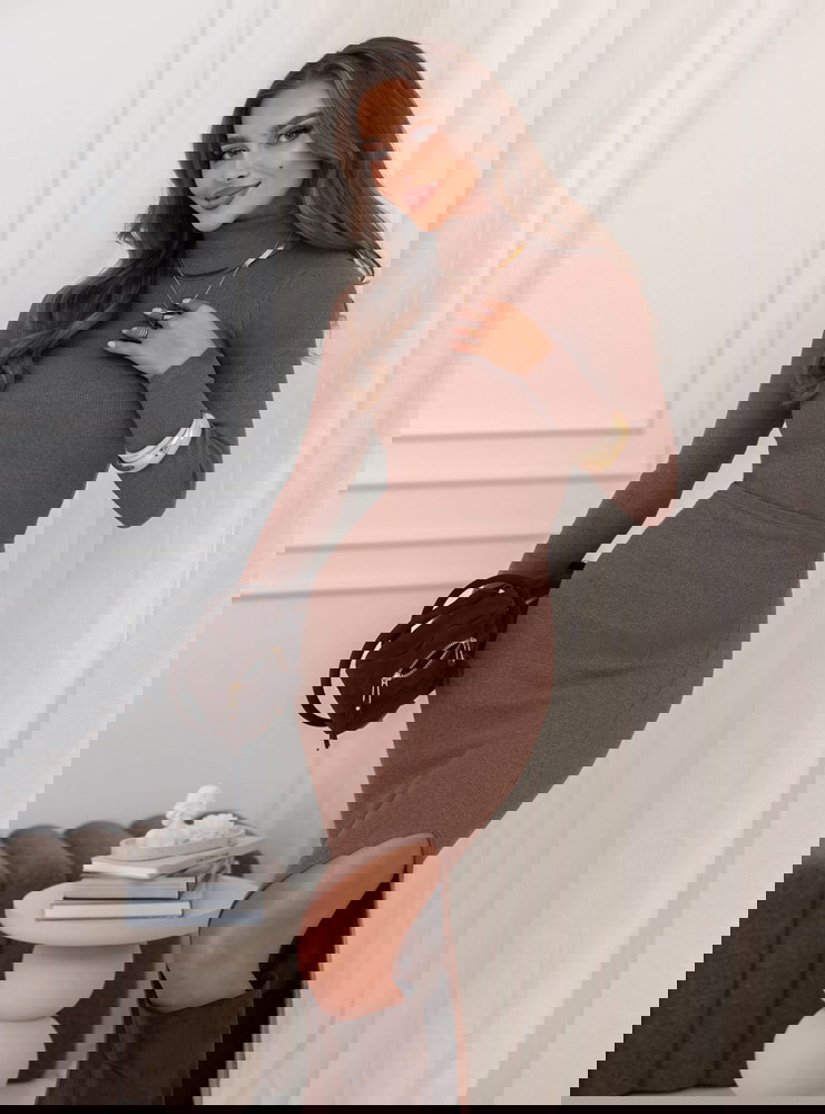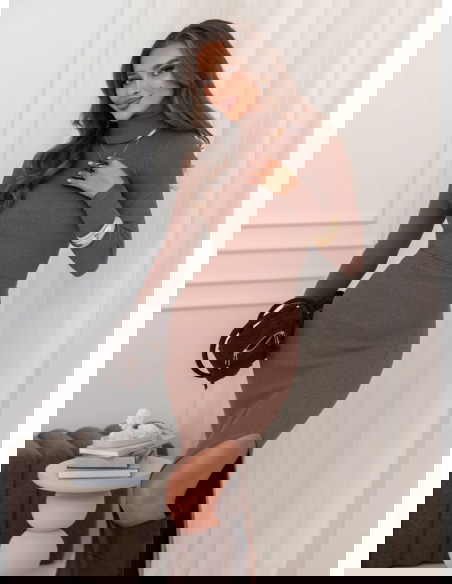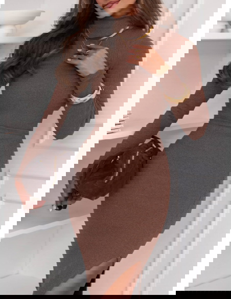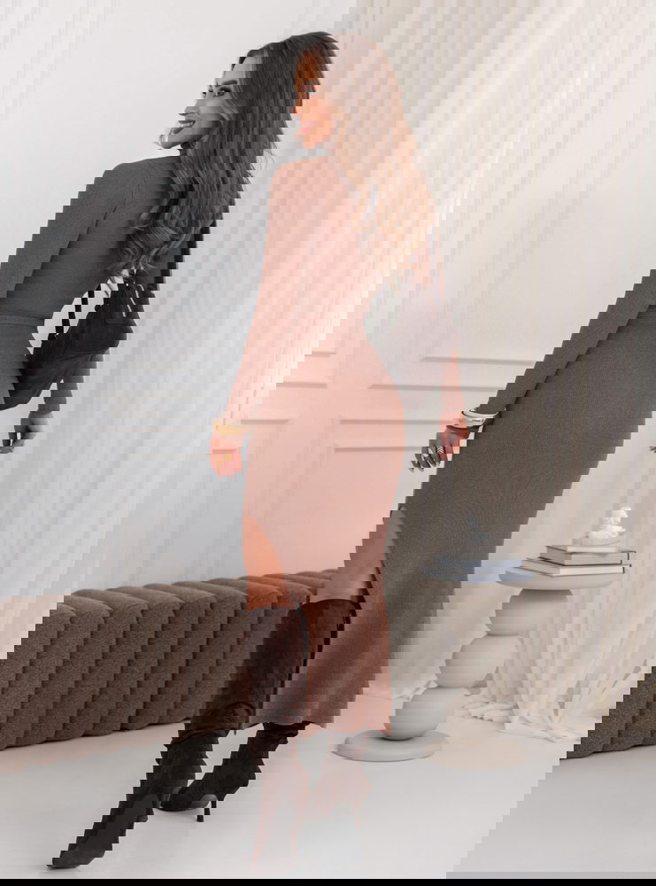Prążkowany komplet bluzka i spódnica z rozcięciem Monagenee - mocha mousse to idealny wybór na jesienne i zimowe dni, kiedy chcesz wyglądać stylowo, ale czuć się wygodnie. Świetnie sprawdzi się do pracy, na spotkanie z przyjaciółkami czy elegancki wieczór.