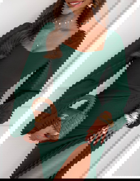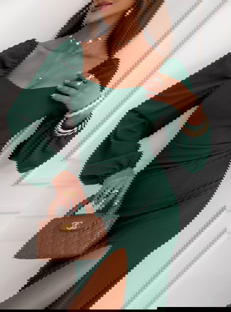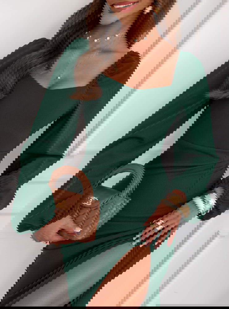 Sukienka z rozcięciem Cathey - butelkowa zieleń to doskonały wybór na eleganckie wyjścia – sprawdzi się na przyjęciach, kolacjach, weselach czy uroczystych spotkaniach. Jej odcień butelkowej zieleni pięknie prezentuje się w wieczorowym świetle, dodając stylizacji głębi i klasy.