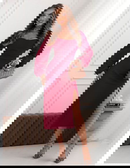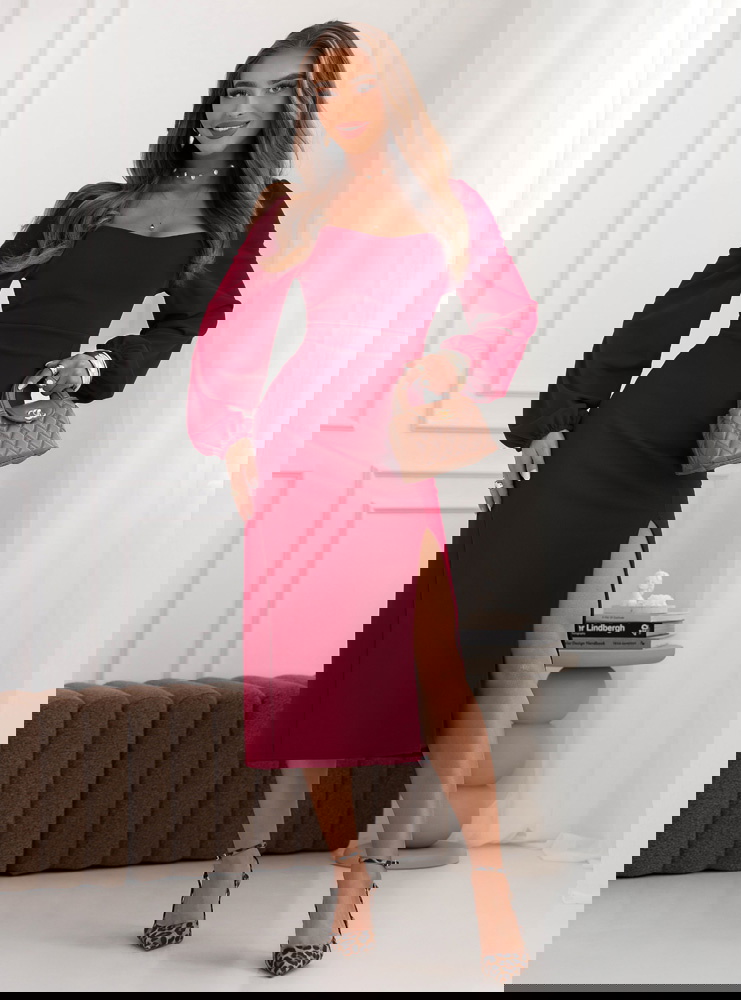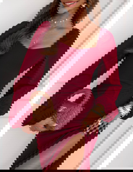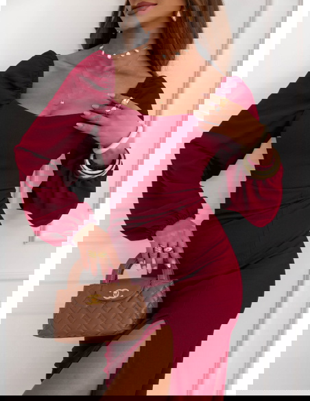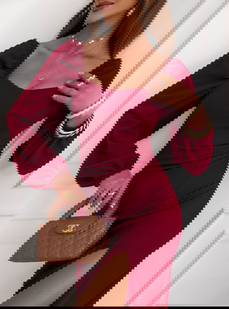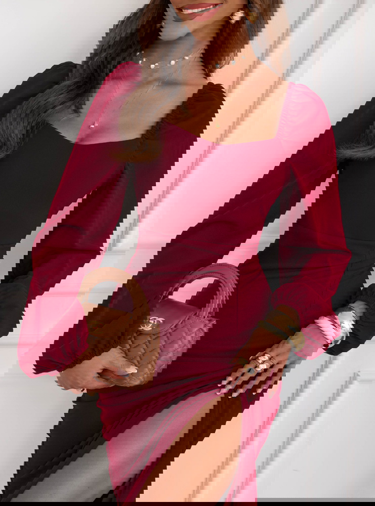 Bordowa sukienka z rozcięciem Cathey to połączenie elegancji, nowoczesności i kobiecego wdzięku. Jej dopasowany krój i rozcięcie nadają całości zmysłowego charakteru, a długie rękawy i długość midi dodają klasy.