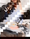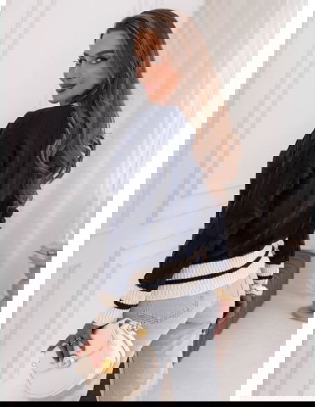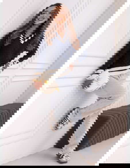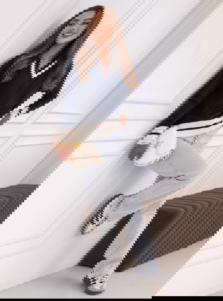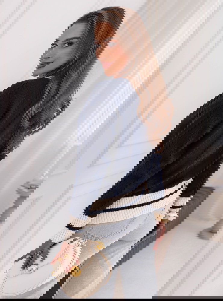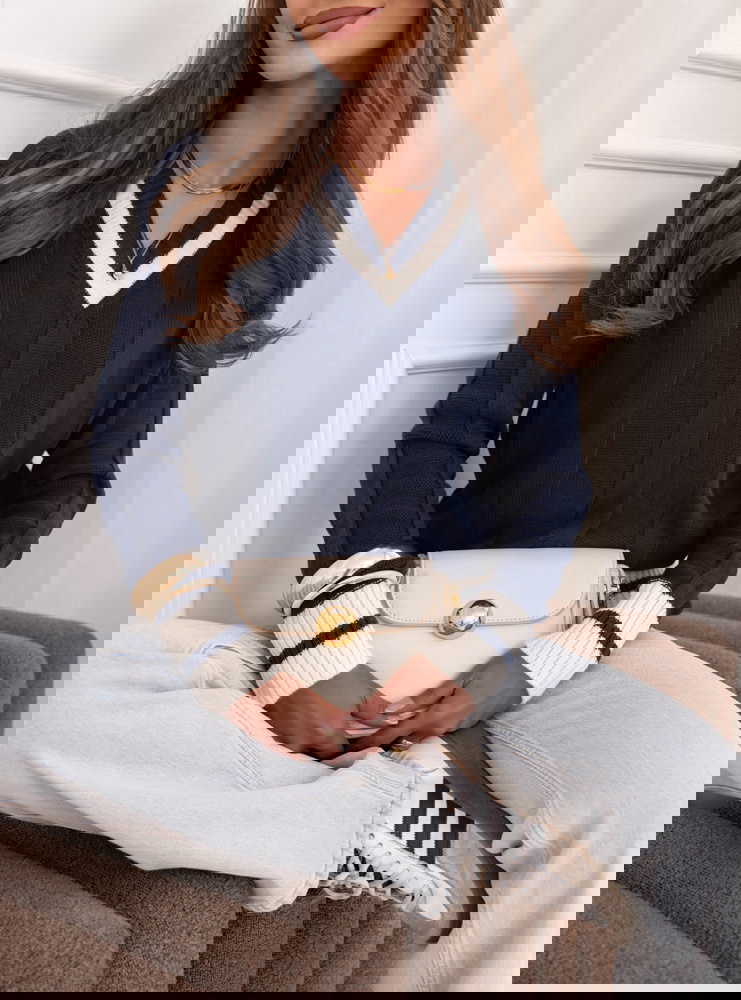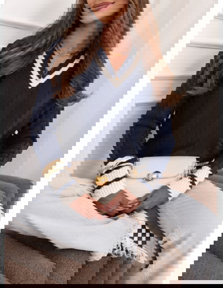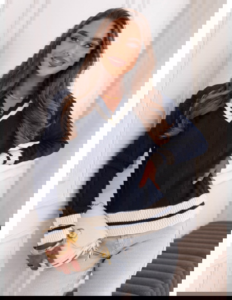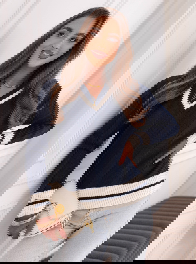 Granatowy sweter z dekoltem w serek Laticia to połączenie klasyki i sportowej elegancji w najlepszym wydaniu. To model, który przyciąga uwagę prostym, ale wyjątkowo stylowym krojem. Granatowy kolor podkreśla jego uniwersalność, a kontrastowe, jasne wykończenia dodają mu świeżości i lekkości. Dekolt w serek pięknie eksponuje szyję, dodając całości kobiecego wdzięku. Sweter inspirowany stylem preppy doskonale sprawdza się w codziennych, casualowych stylizacjach, ale z powodzeniem można go również nosić w bardziej eleganckich zestawieniach. Subtelny prążkowany splot i delikatne detale przy mankietach nadają mu wyjątkowego charakteru. To model, który łączy modny wygląd z komfortem noszenia, sprawiając, że każda stylizacja nabiera nowoczesnego, stylowego wyrazu. Idealny na chłodniejsze dni – pasuje zarówno do jeansów, jak i do spódnicy. To sweter, który bez wysiłku wprowadza do garderoby elegancję w codziennym wydaniu.