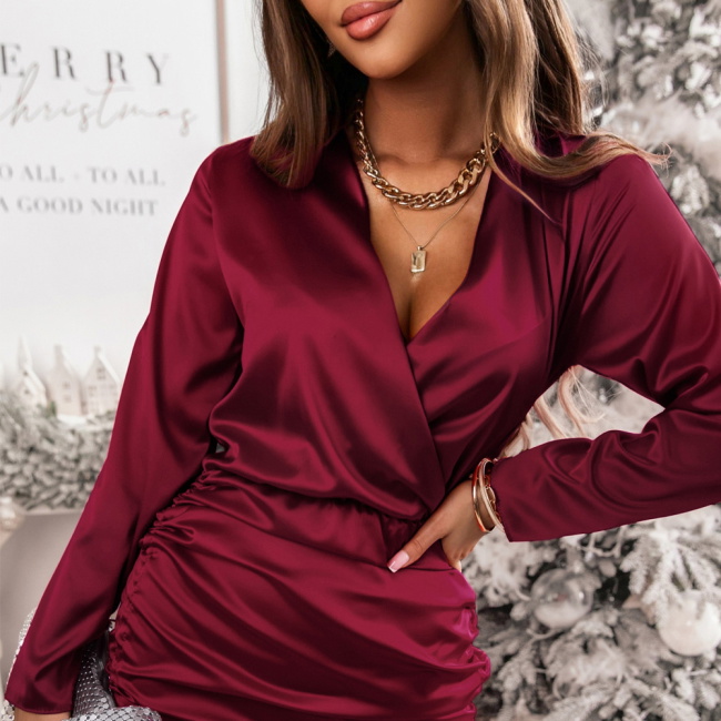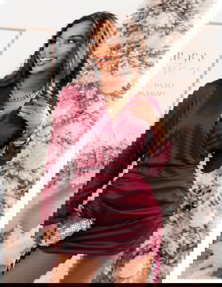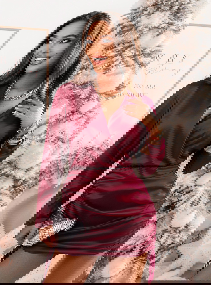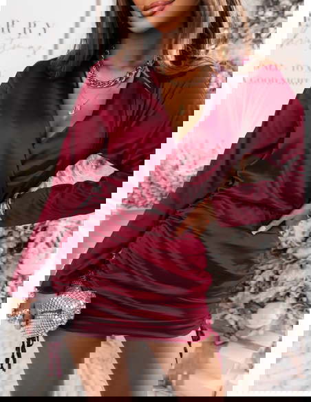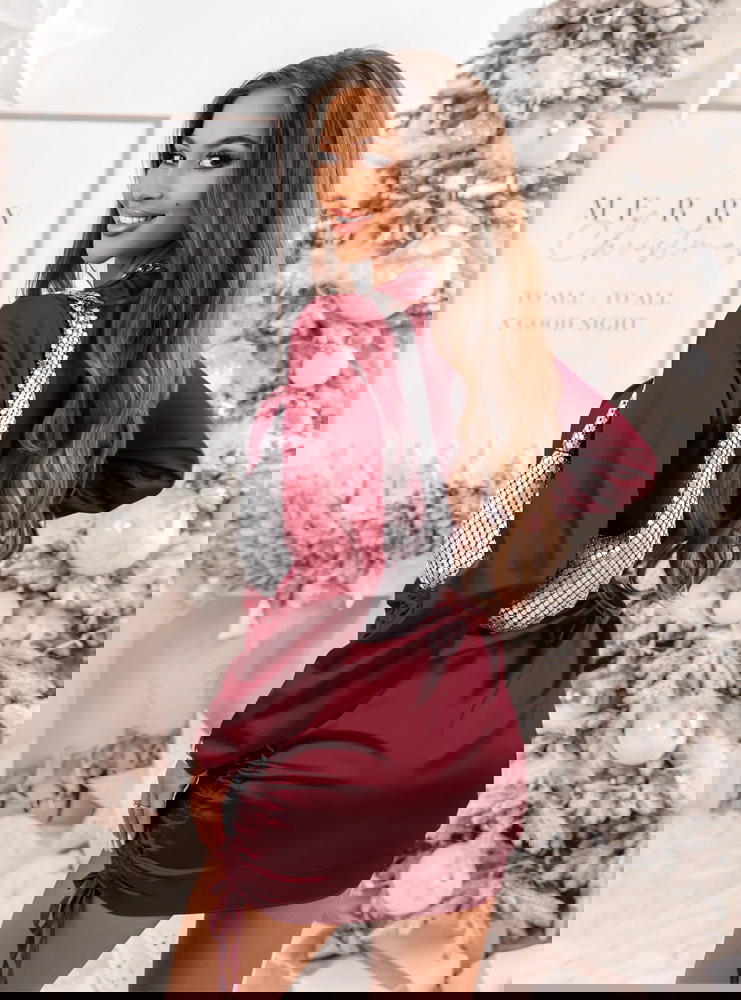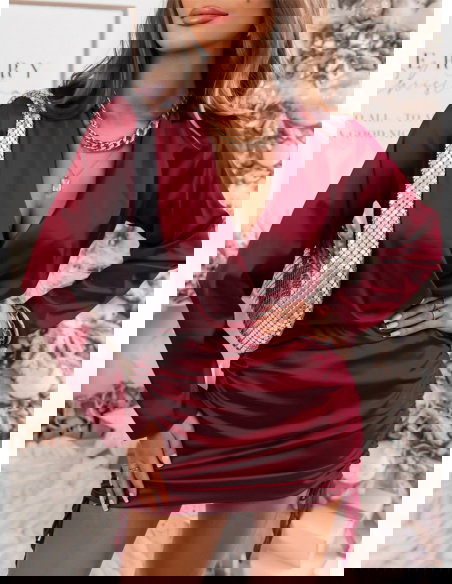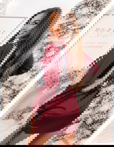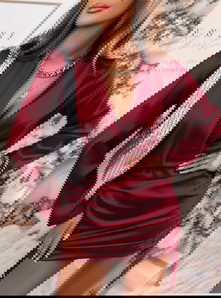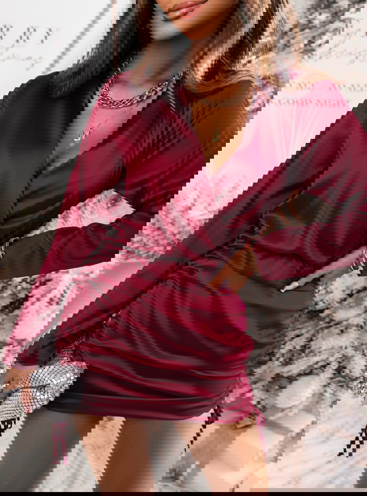 Bordowa satynowa sukienka ze ściągaczami po bokach Sabinee to propozycja stworzona z myślą o kobietach, które kochają elegancję w zmysłowym wydaniu. Jej połyskujący materiał pięknie odbija światło, nadając całości luksusowego charakteru. Głęboki odcień bordo podkreśla kobiecość i doskonale wpisuje się w klimat wyjątkowych okazji. Dopasowany krój idealnie podkreśla sylwetkę, a delikatne ściągacze po bokach subtelnie modelują figurę, nadając jej harmonijnych proporcji. Dekolt kopertowy dodaje sukience szyku i klasy, jednocześnie eksponując szyję i obojczyki. Długość mini w połączeniu z długim rękawem tworzy idealny balans pomiędzy elegancją a zmysłowością. To sukienka, w której każda kobieta poczuje się wyjątkowo – pewna siebie, stylowa i kobieca. Świetnie sprawdzi się podczas wieczornych wyjść, gdy chcesz olśniewać swoim wyglądem.