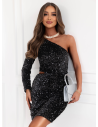 Czarna cekinowa sukienka mini Sanndy to kwintesencja elegancji, blasku i kobiecego szyku. To model, który od razu przyciąga uwagę i sprawia, że każda kobieta czuje się wyjątkowo. Czerń w połączeniu z cekinami tworzy zjawiskowy efekt, idealny na wieczorne wyjścia i wyjątkowe okazje. Fason z jednym odkrytym ramieniem dodaje jej nowoczesnego, zmysłowego charakteru. Sukienka doskonale podkreśla figurę, eksponując to, co w sylwetce najpiękniejsze. Jej długość mini w subtelny sposób akcentuje nogi, zachowując przy tym klasę i elegancję. Każdy ruch w tej sukience mieni się tysiącem refleksów, tworząc spektakularne wrażenie. To propozycja dla kobiet, które lubią błyszczeć i czuć się pewnie w swoim stylu. Z nią każda stylizacja nabiera charakteru i wyjątkowego wyrazu. To sukienka, w której nie sposób pozostać niezauważoną.