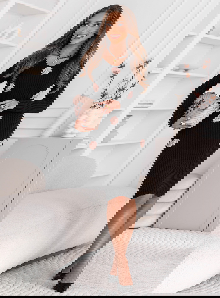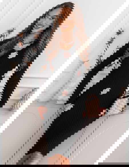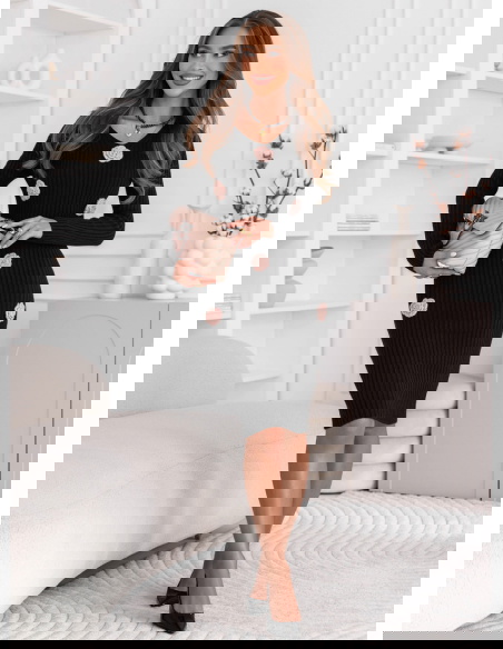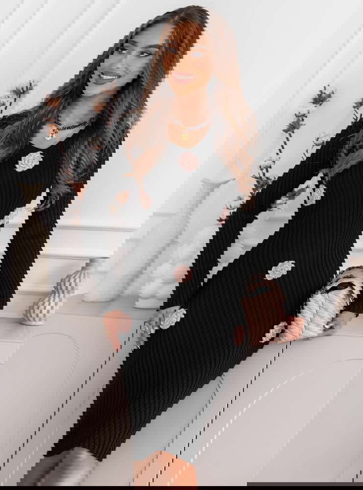 Czarna sukienka swetrowa z ozdobnymi kwiatkami Deaesta to połączenie ponadczasowej elegancji i subtelnych, romantycznych detali. Jej dopasowany fason i delikatne zdobienia sprawiają, że każda stylizacja nabiera wyjątkowego charakteru.