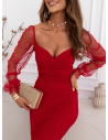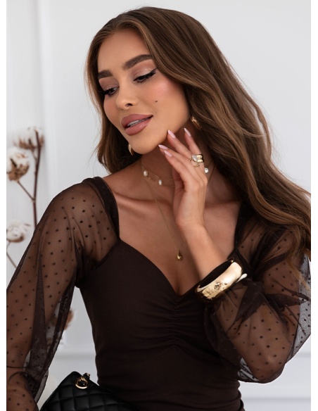 Czekoladowa dopasowana sukienka z tiulowymi rękawami Kleenie
