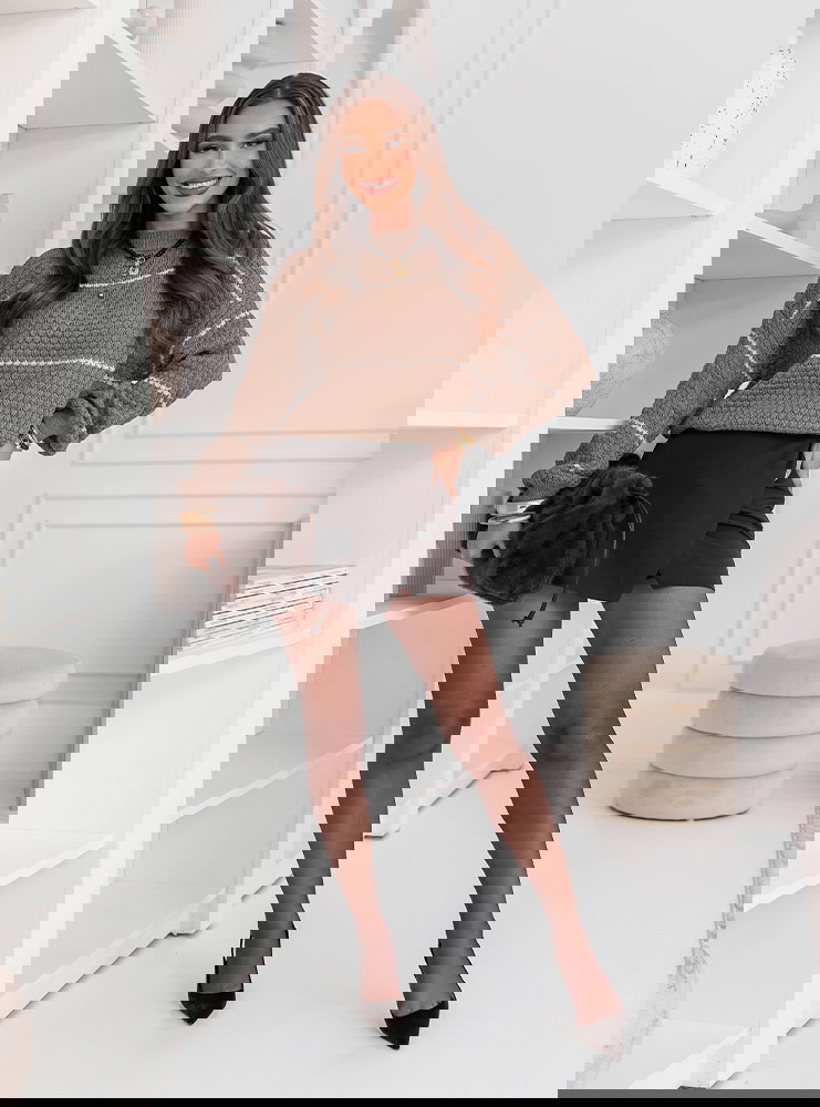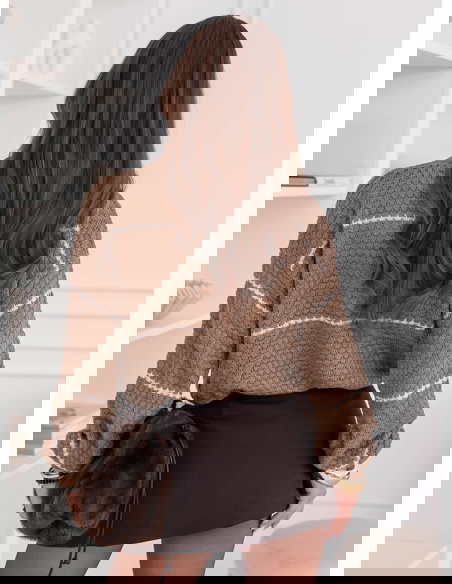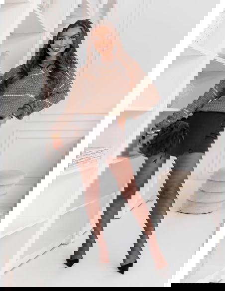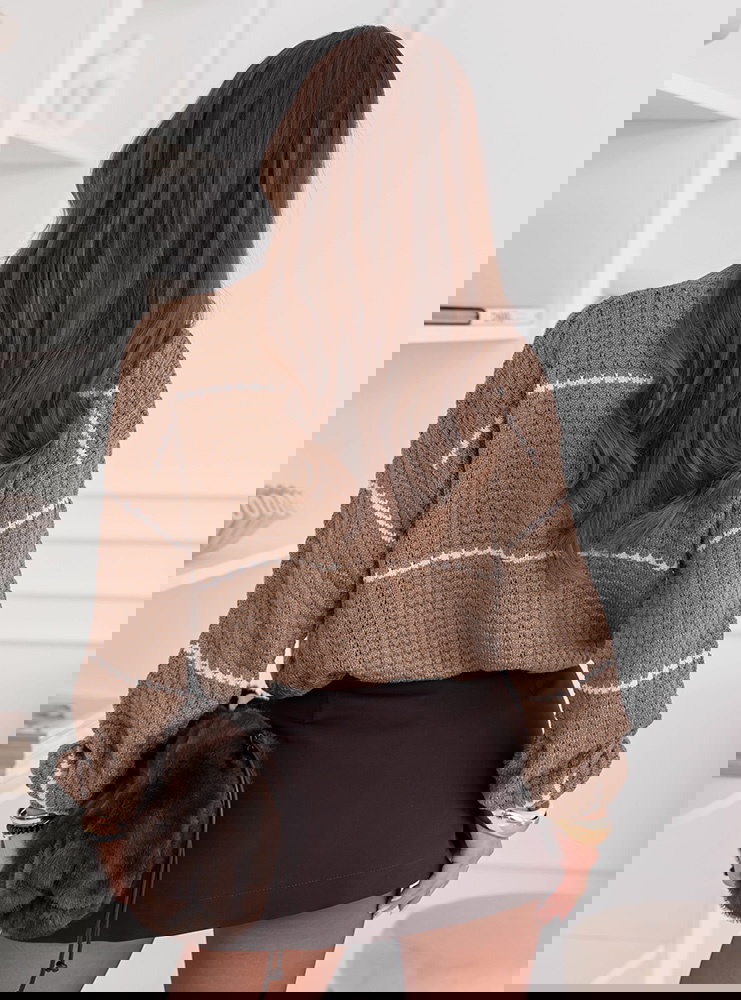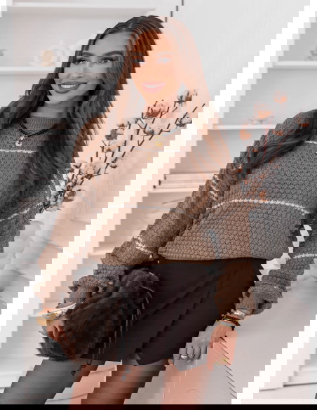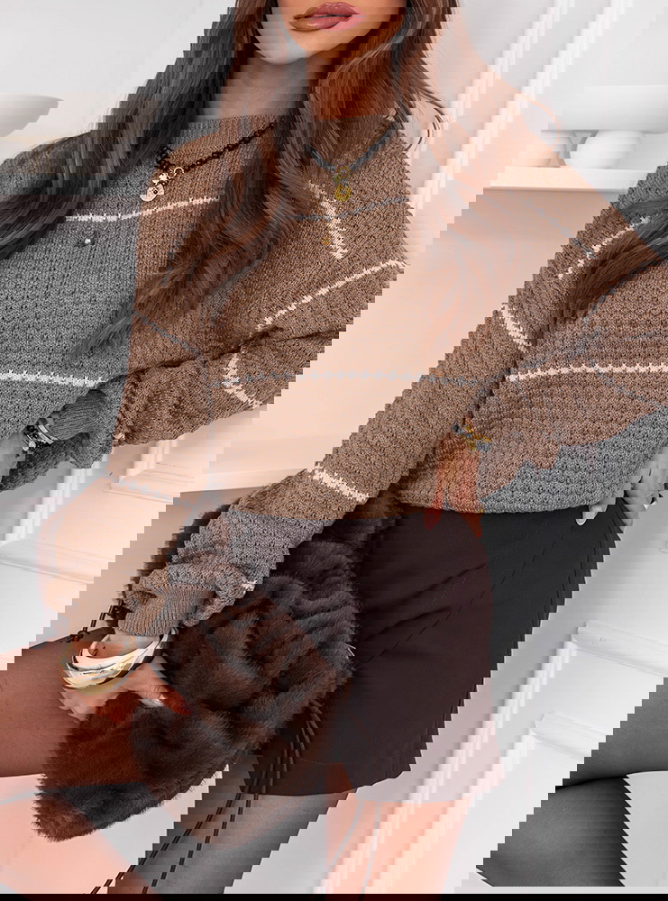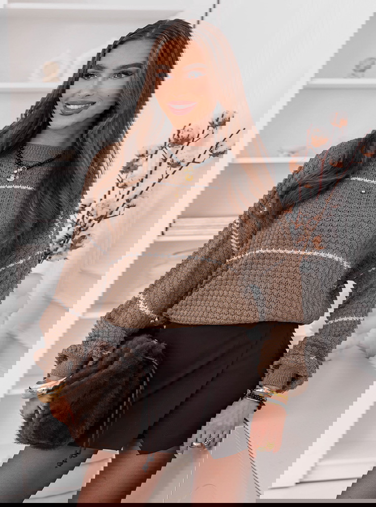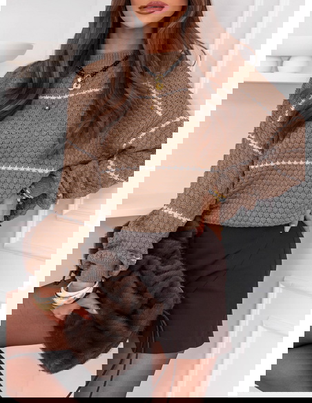 Sweter z ozdobnym splotem w paski Charito - mocha mousse to kwintesencja jesiennego stylu w eleganckim, a zarazem przytulnym wydaniu. Jego ciepły odcień brązu z delikatnymi akcentami w postaci jaśniejszych pasków wprowadza subtelny kontrast i nadaje całości harmonii. To model, który łączy wygodę z ponadczasową estetyką, idealny na chłodniejsze dni. Luźniejszy krój zapewnia swobodę ruchów, a zarazem prezentuje się stylowo i kobieco. Ozdobny splot nadaje mu wyjątkowej struktury i głębi, dzięki czemu nawet najprostsza stylizacja nabiera charakteru. To sweter, który zachwyca detalami i perfekcyjnym wyważeniem między klasyką a nowoczesnością. Idealny dla kobiet ceniących połączenie funkcjonalności i dobrego stylu. Świetnie komponuje się z eleganckimi spodniami, spódnicami czy jeansami. W jesiennej garderobie zajmie zasłużone, wyjątkowe miejsce. To model, który sprawi, że każda stylizacja będzie wyglądać z klasą i wyczuciem trendów.