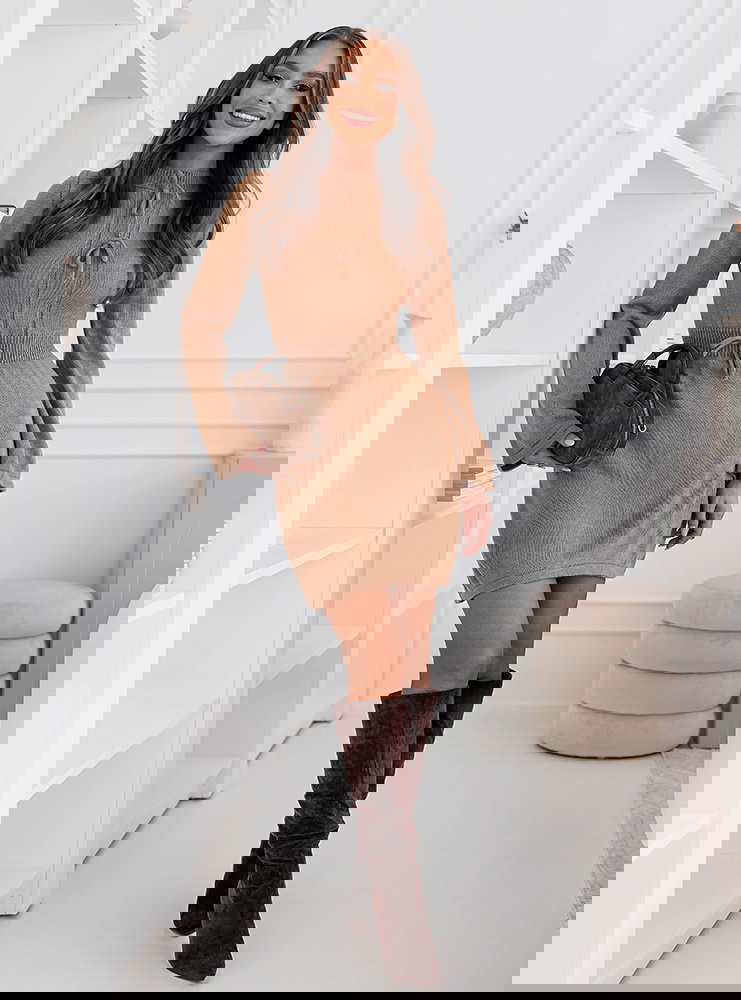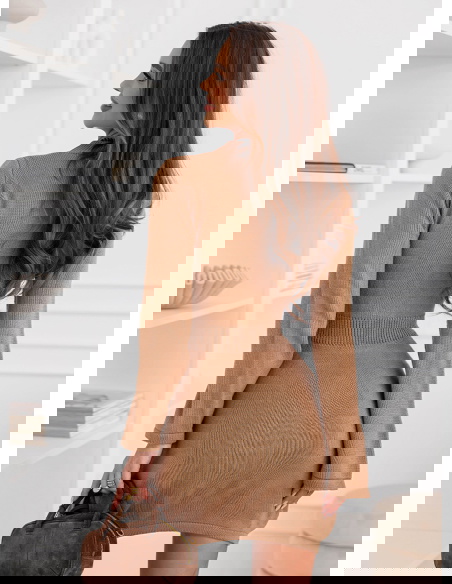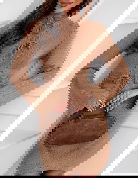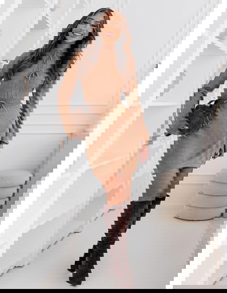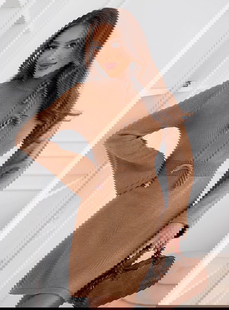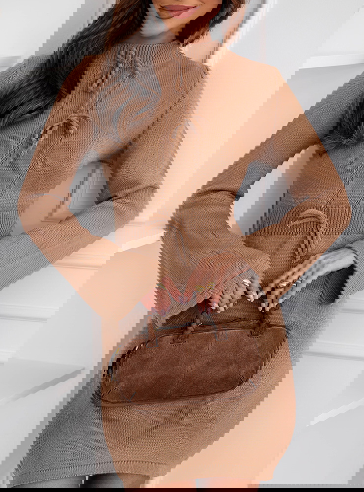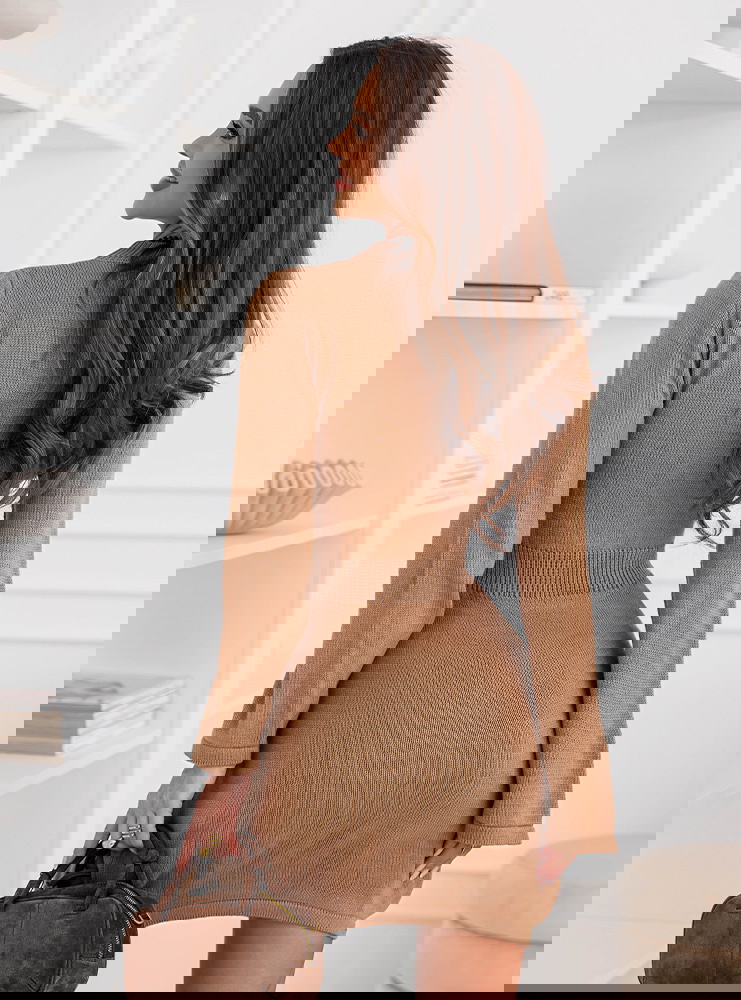 Swetrowa sukienka mini Maitildaa - mocha mousse sprawdzi się w wielu sytuacjach. Jest idealna na co dzień, do pracy, na spotkania czy spacery po mieście.