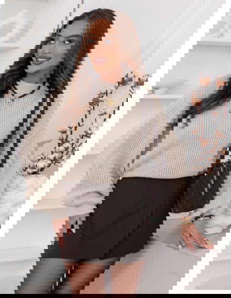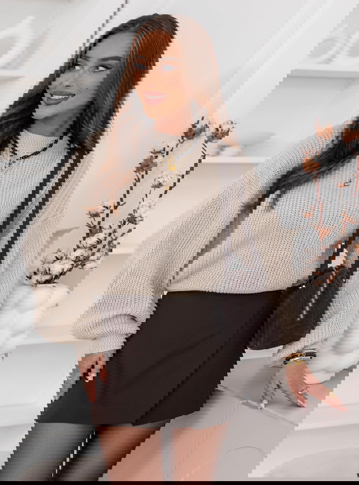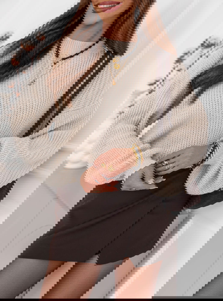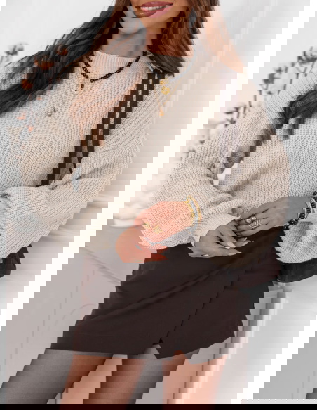 Beżowy krótki sweter z bufiastymi rękawami Ninette to kwintesencja kobiecego stylu i delikatnej elegancji. Jego subtelny kolor sprawia, że doskonale komponuje się z jesienną paletą barw. To model, który łączy wygodę z modnym charakterem, tworząc idealną bazę do wielu stylizacji. Luźniejszy krój w połączeniu z bufiastymi rękawami nadaje mu lekkości i dziewczęcego wdzięku. Sweter przyciąga uwagę swoją prostotą, ale jednocześnie zachwyca detalami, które czynią go wyjątkowym. Beżowy odcień dodaje mu uniwersalności i elegancji – idealny zarówno na co dzień, jak i na bardziej dopracowane okazje. To propozycja, która sprawia, że każda stylizacja nabiera przytulnego, jesiennego klimatu. Krótszy fason pięknie podkreśla talię i świetnie współgra z wysokim stanem spodni lub spódnic. Beżowy krótki sweter z bufiastymi rękawami to połączenie subtelności i nowoczesnego stylu, w którym każda kobieta poczuje się wyjątkowo.