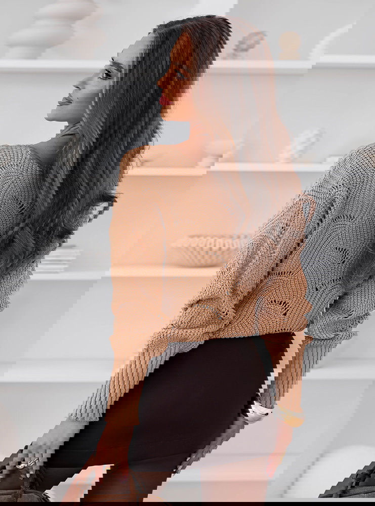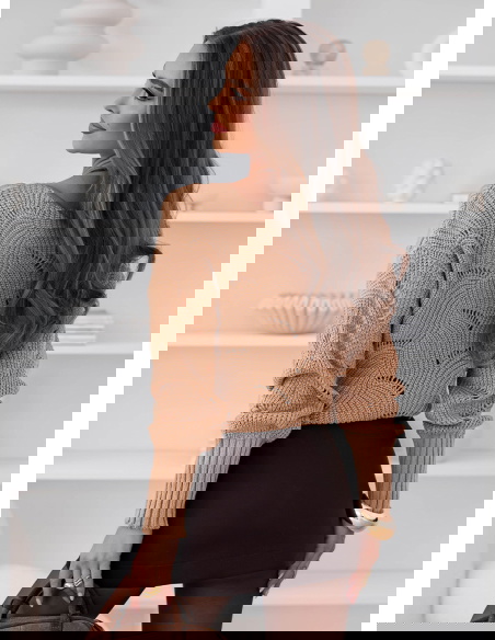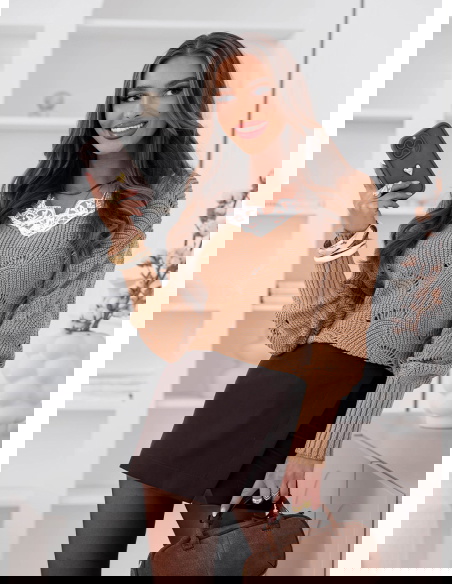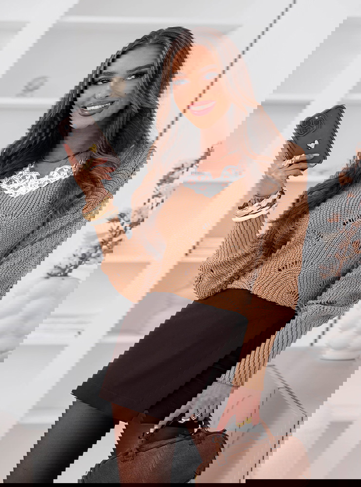 Sweter z ozdobną koronką Lashunta - mocha mousse to połączenie kobiecej delikatności i codziennej elegancji. To model, który od razu przyciąga uwagę swoim wyjątkowym detalem przy dekolcie. Ciepły, karmelowy odcień mocha mousse doskonale wpisuje się w jesienną paletę barw, dodając stylizacji przytulnego charakteru. Dekolt w serek wykończony subtelną, białą koronką nadaje całości romantycznego i eleganckiego akcentu. Sweter zachwyca swoją prostotą, a jednocześnie ma w sobie coś wyjątkowego – to detal, który robi różnicę. Luźniejszy krój zapewnia wygodę, a jednocześnie pięknie układa się na sylwetce. To idealna propozycja na chłodniejsze dni, gdy chcesz wyglądać stylowo i czuć się komfortowo. Dzięki koronkowemu wykończeniu nabiera lekkości i kobiecego wdzięku. To model, który sprawdzi się zarówno w casualowych, jak i bardziej eleganckich stylizacjach. W nim każda kobieta poczuje się subtelnie i wyjątkowo.