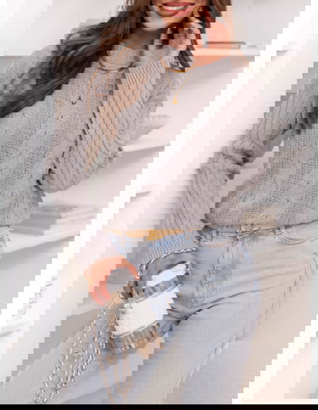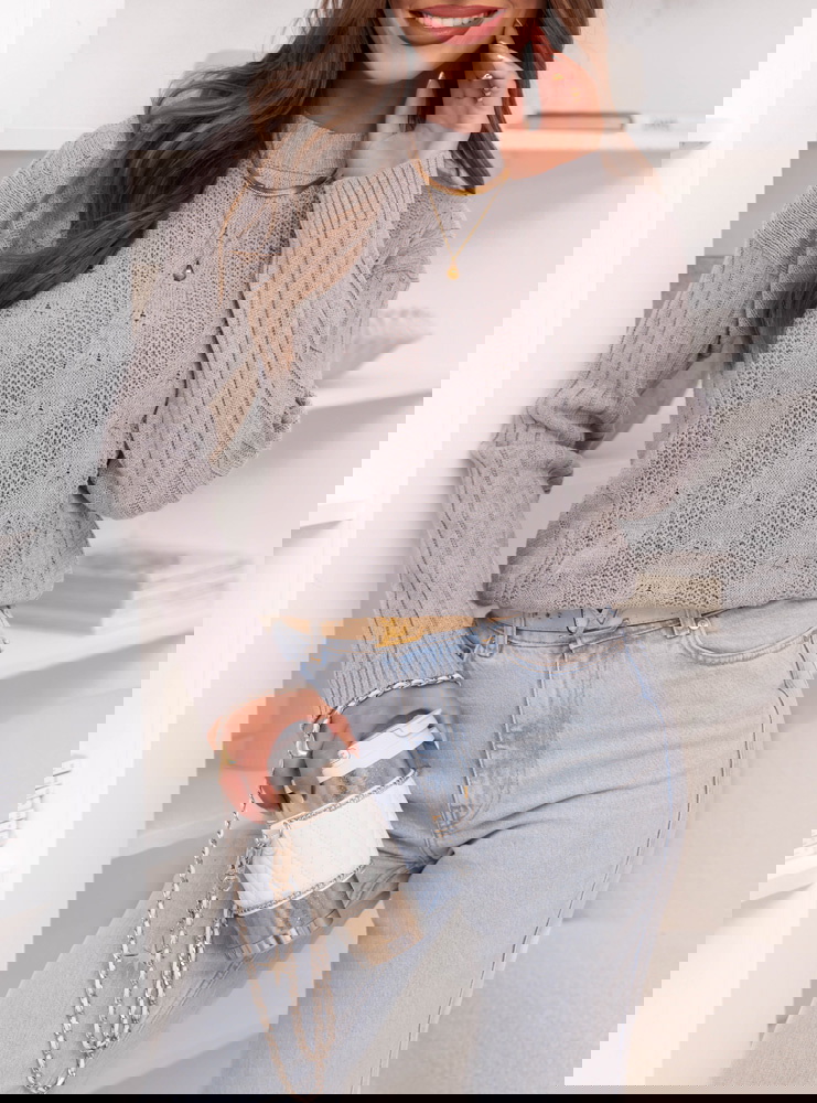 Szary sweter z warkoczowymi splotami Kahlea to klasyczna propozycja w nowoczesnym wydaniu, idealna na chłodniejsze dni. Jego ponadczasowy odcień i elegancki splot sprawiają, że stanowi doskonałą bazę do wielu stylizacji. To model, który łączy subtelną elegancję z codzienną wygodą, podkreślając jednocześnie jesienny klimat. Delikatna faktura dodaje mu głębi i struktury, a klasyczny fason sprawia, że wygląda świetnie na każdej sylwetce. To sweter, który wprowadza do stylizacji harmonię i spokój, zachowując przy tym nutę wyrafinowania. Idealny dla kobiet, które cenią prostotę w eleganckim wydaniu. Szary kolor pięknie współgra z ciepłymi odcieniami beżu, brązu czy kremu, tworząc modne, spójne połączenia. To niezastąpiony element garderoby, który sprawdzi się zarówno w pracy, jak i w wolnym czasie. W tym swetrze każda stylizacja nabierze przytulnego, jesiennego charakteru.