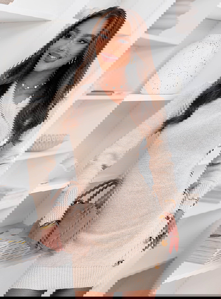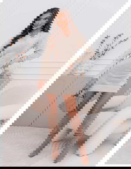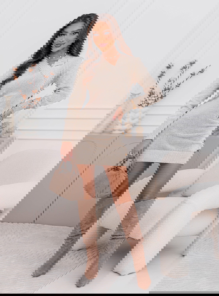 Beżowa swetrowa sukienka z ozdobnymi guzikami Milteisha to elegancka propozycja, która łączy wygodę i styl w jednym. Jej klasyczny, jasny odcień pięknie rozświetla stylizację i wprowadza ciepły, jesienny klimat. To model, który doskonale podkreśla sylwetkę, zachowując przy tym subtelność i kobiecy wdzięk. Delikatny dekolt w kształcie kopertowym nadaje całości elegancji, a złote guziki wzdłuż boku stanowią wyjątkowy, przyciągający wzrok detal. To sukienka, która emanuje prostotą, ale nie brakuje jej charakteru – każdy element jest tu przemyślany i dopracowany. Długość mini subtelnie eksponuje nogi, zachowując przy tym wyważony, stylowy wygląd. Beżowy kolor sprawia, że model jest niezwykle uniwersalny i pasuje do wielu okazji. To idealna propozycja dla kobiet, które lubią wyglądać z klasą, nie rezygnując z wygody. W tej sukience każda stylizacja nabiera ciepła, lekkości i eleganckiego uroku.