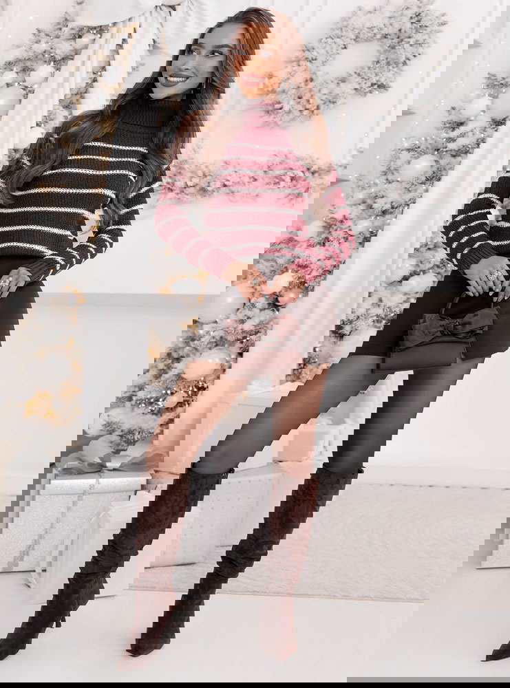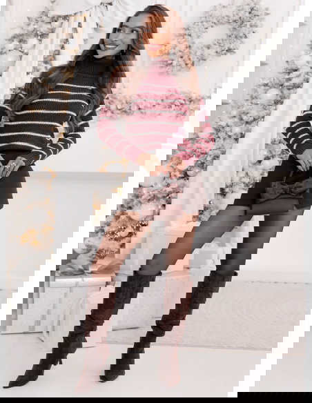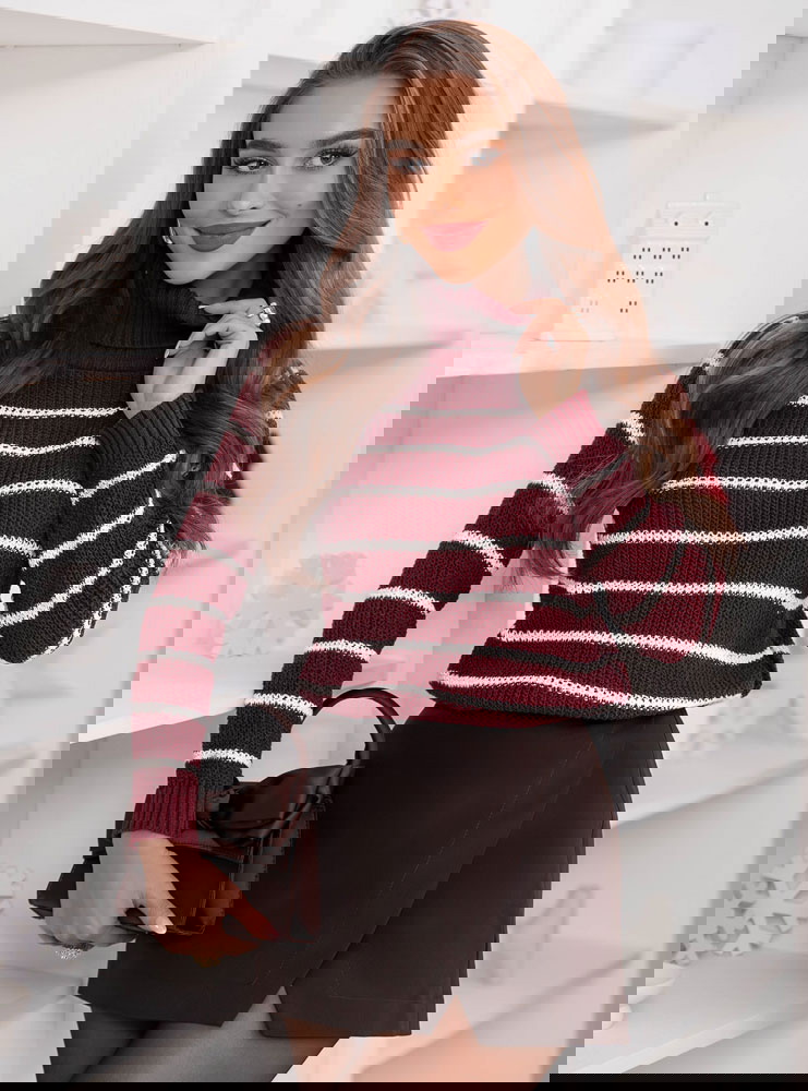 Bordowy sweter w paski Chrystallyn to doskonałe połączenie klasyki i nowoczesnego stylu. Jego intensywny, głęboki kolor w zestawieniu z kontrastowymi paskami nadaje mu eleganckiego, ale jednocześnie codziennego charakteru. To model, który sprawdzi się w wielu stylizacjach – od miejskich po bardziej casualowe. Wysoki golf dodaje mu przytulności i sprawia, że idealnie pasuje na chłodniejsze dni. Sweter ma lekko wydłużony krój, dzięki czemu prezentuje się wyjątkowo stylowo zarówno w połączeniu z jeansami, jak i legginsami. Subtelne rozcięcia po bokach dodają lekkości i swobody ruchów. To uniwersalny wybór dla kobiet, które lubią czuć się komfortowo, nie rezygnując z kobiecego wdzięku. Bordowy sweter w paski przyciąga spojrzenia, a jego ponadczasowy design sprawia, że pozostaje modny niezależnie od sezonu.