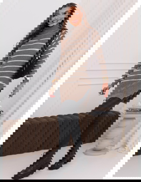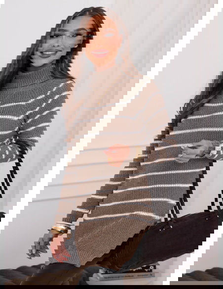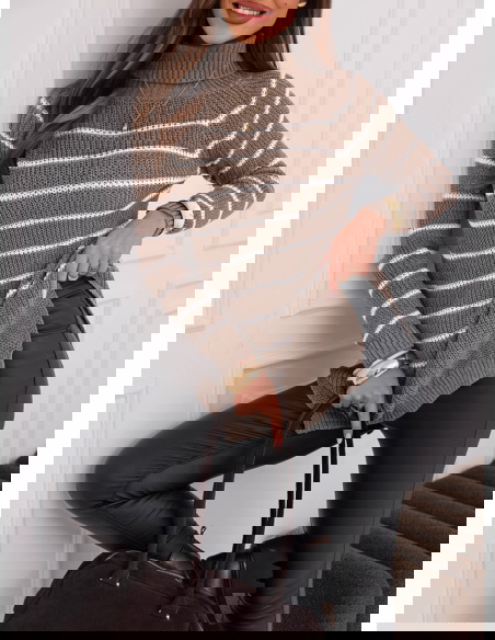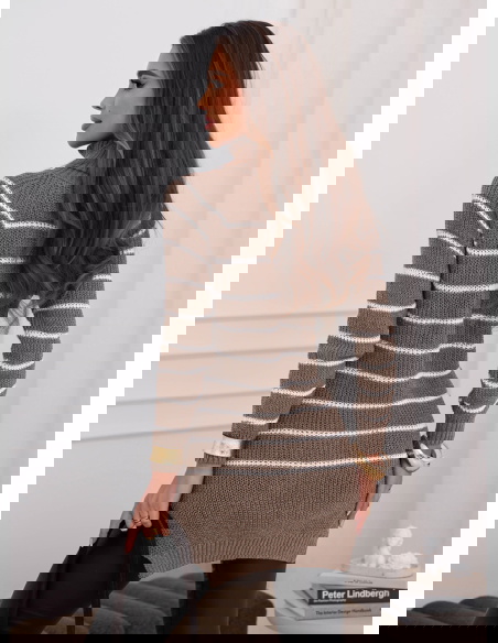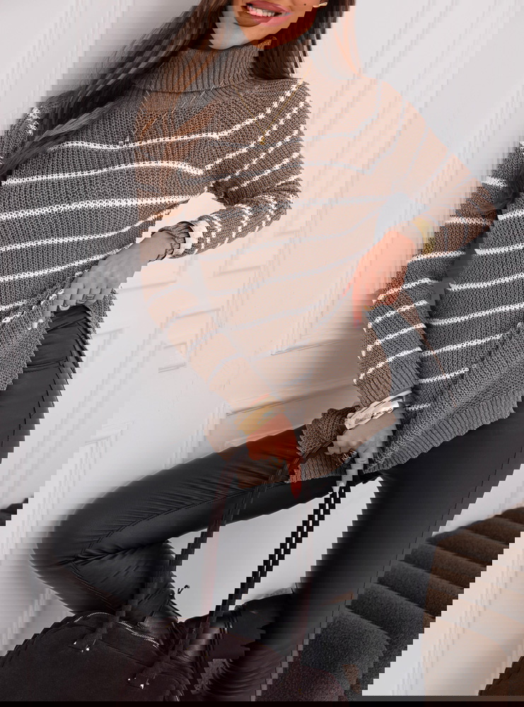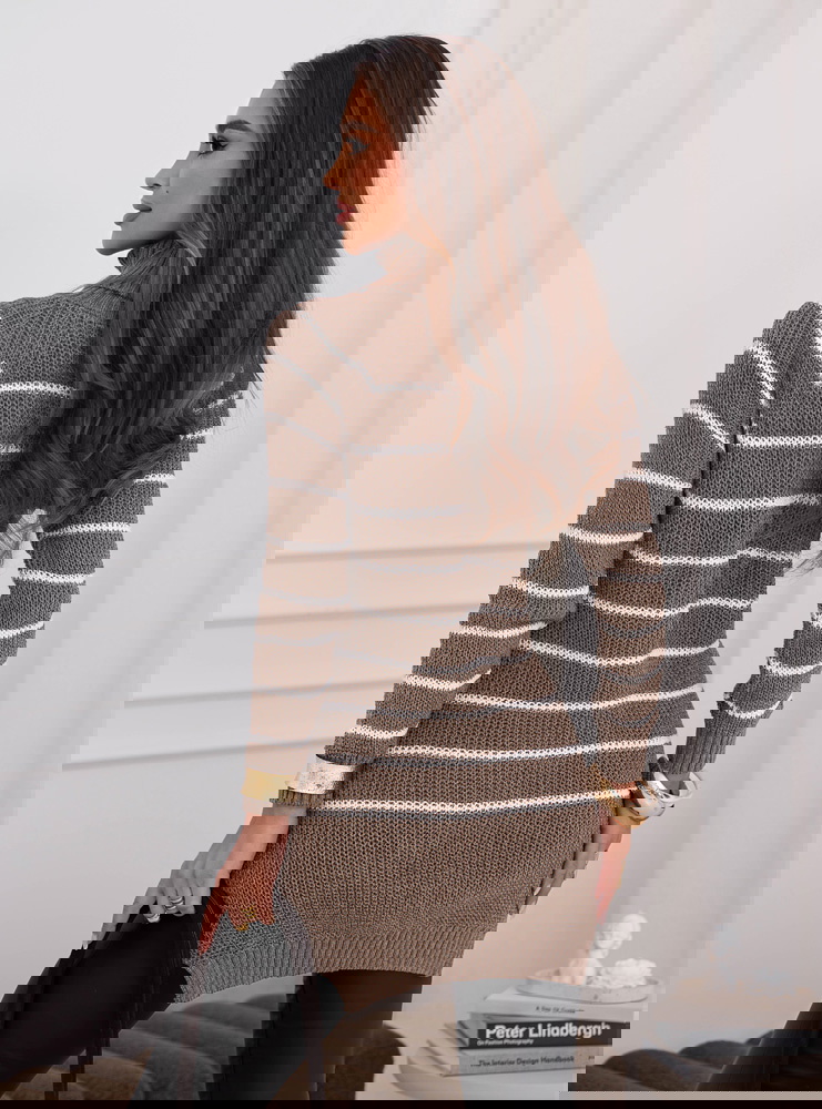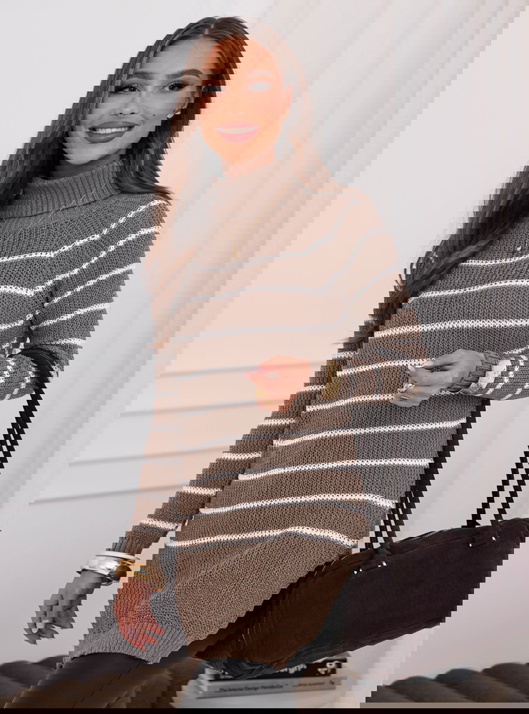 Czekoladowy sweter w paski Chrystallyn to doskonała propozycja na co dzień, do pracy, na spacer czy spotkanie ze znajomymi. Można go zestawić z legginsami, jeansami lub dopasowanymi spodniami, tworząc przy tym wiele modnych stylizacji.