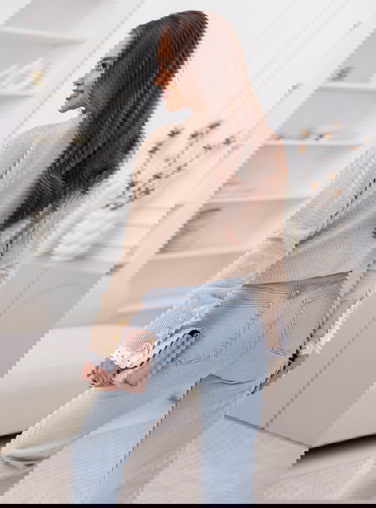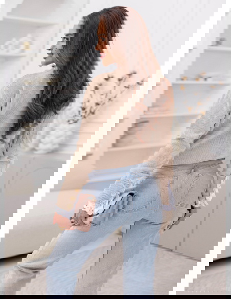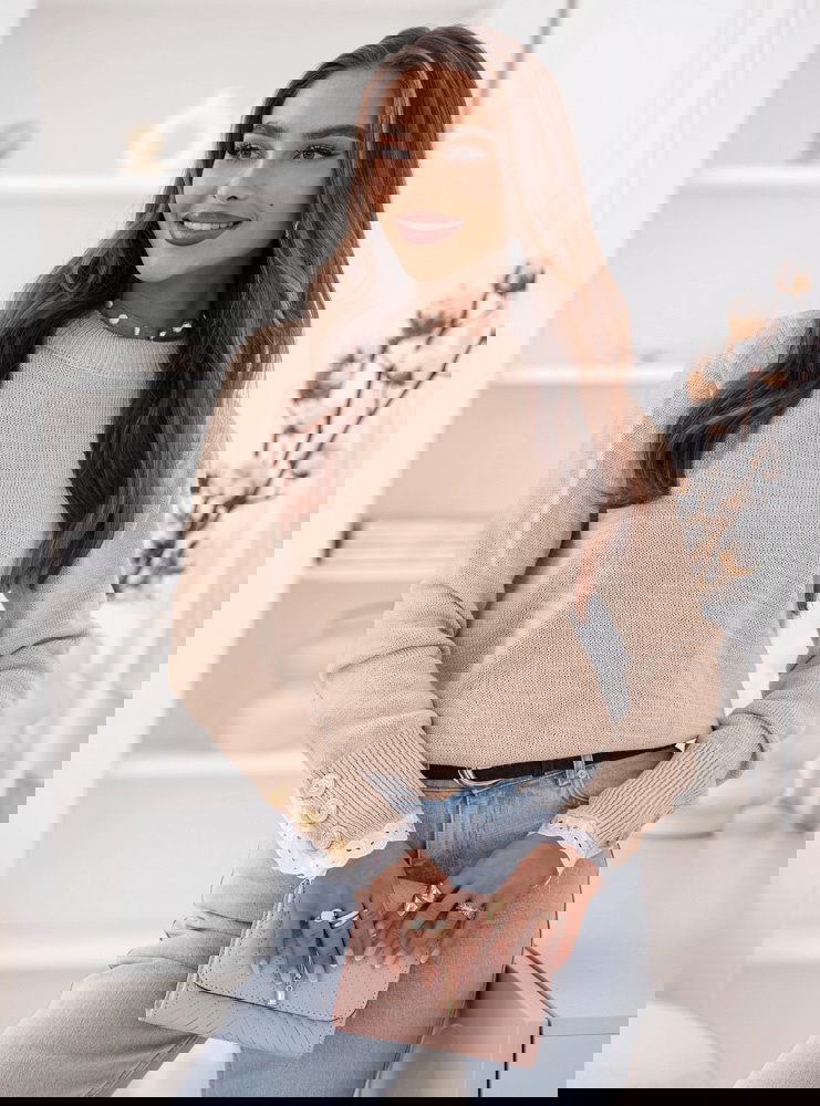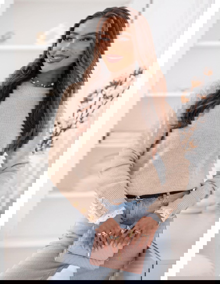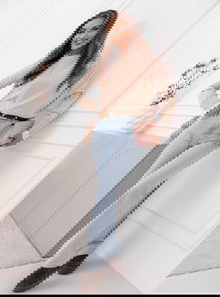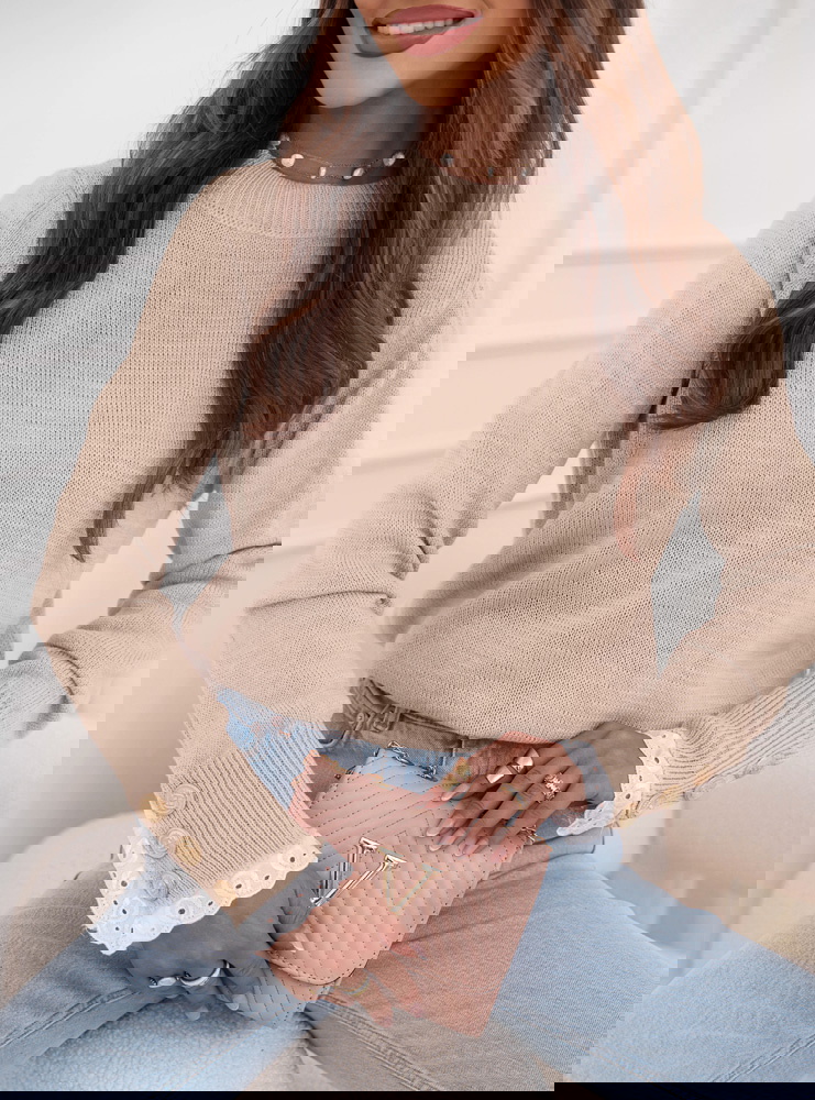 Beżowy sweter z koronką na rękawach Teressa to doskonały wybór zarówno na co dzień, jak i na bardziej wyjątkowe okazje. Świetnie sprawdzi się w biurze, podczas spotkań czy rodzinnych przyjęć.