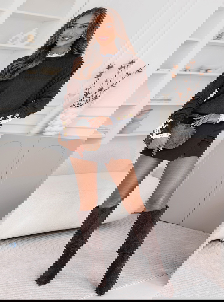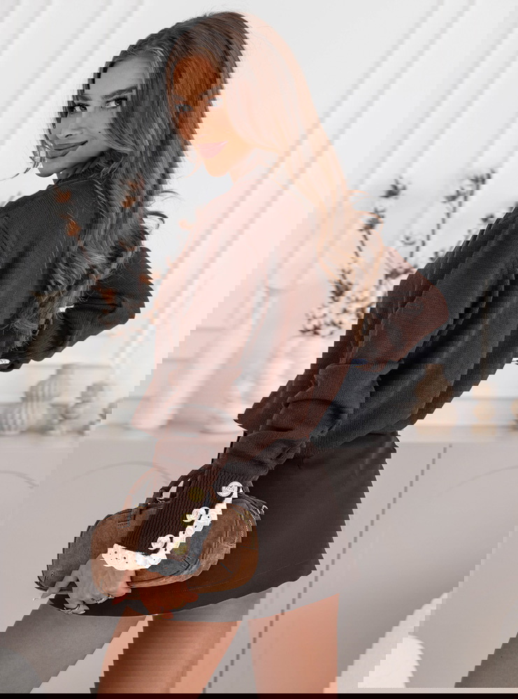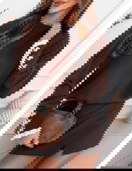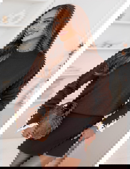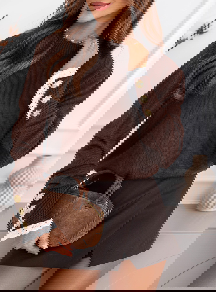 Czekoladowy sweter z koronką na rękawach Teressa doskonale sprawdzi się w wielu stylizacjach. Będzie idealny do pracy, na spotkania, a także na wieczorne wyjścia.