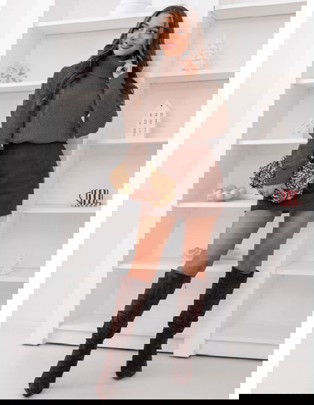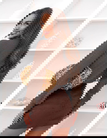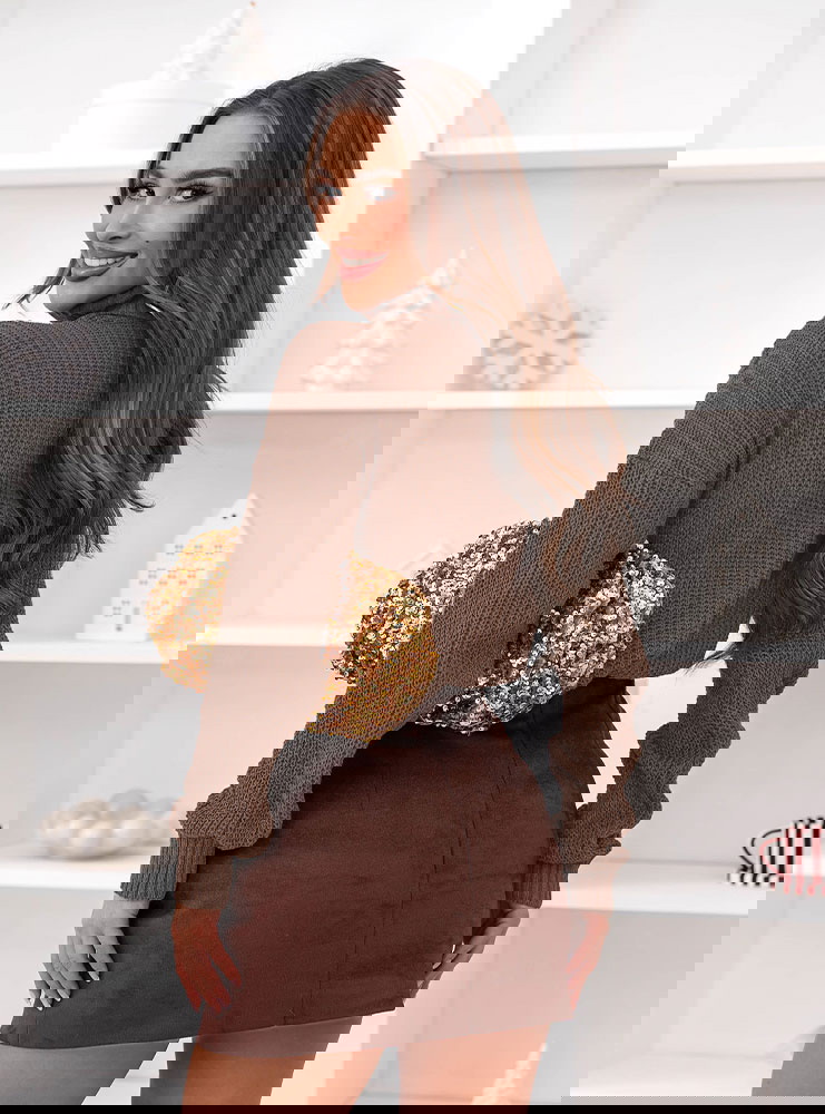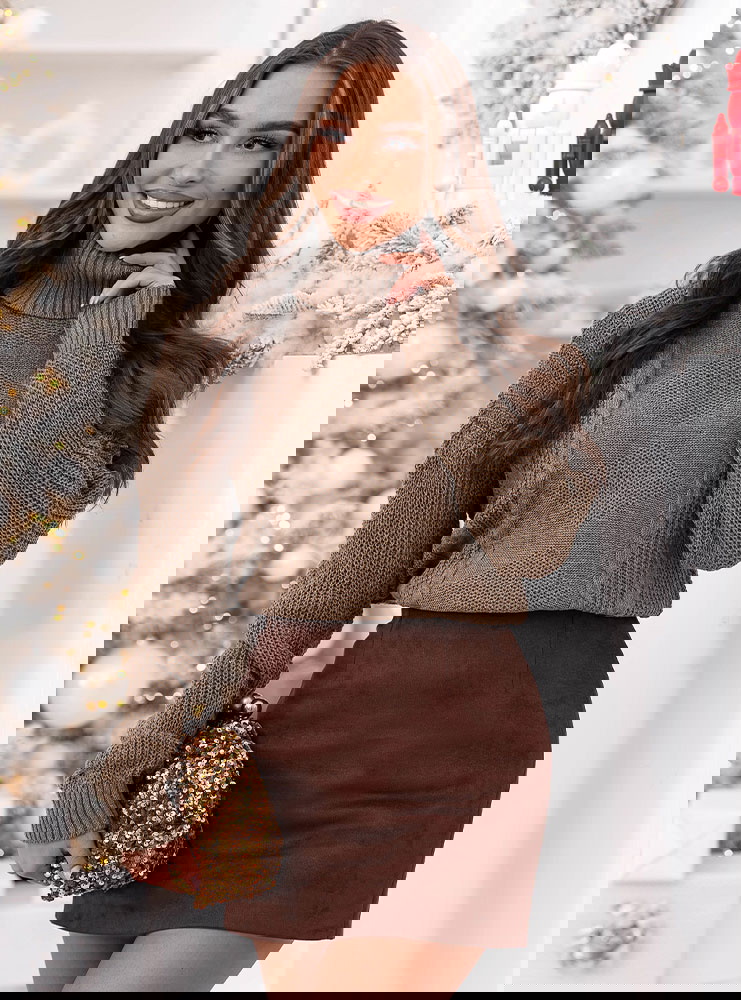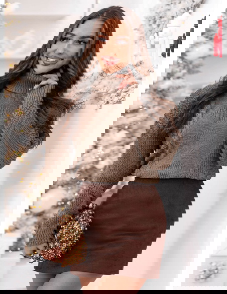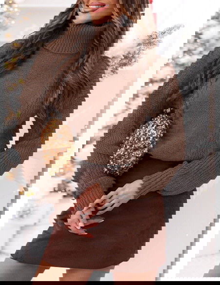 Czekoladowy sweter z golfem Evilou to esencja jesiennej elegancji i przytulnego stylu. Jego głęboki, ciepły odcień brązu doskonale wpisuje się w klimat chłodniejszych dni. To model, który zachwyca klasycznym krojem i subtelnymi detalami, tworząc idealną równowagę między wygodą a kobiecym szykiem. Wysoki golf otula szyję, nadając stylizacji przyjemnego, otulającego charakteru. Długość swetra i dopasowany krój pięknie podkreślają sylwetkę, zachowując jednocześnie pełną swobodę ruchów. Delikatne sploty wzdłuż przodu dodają mu oryginalności i sprawiają, że całość prezentuje się wyjątkowo. To sweter, który bez wysiłku łączy modny wygląd z funkcjonalnością. Idealny na sezon jesienno-zimowy, kiedy liczy się zarówno ciepło, jak i styl. Jego ponadczasowa forma sprawia, że będzie doskonałym wyborem na wiele sezonów. To klasyka, która zawsze wygląda dobrze – niezależnie od okazji.