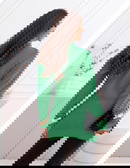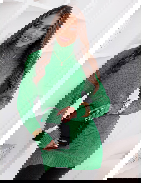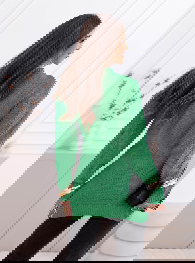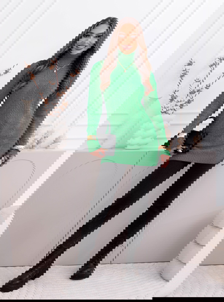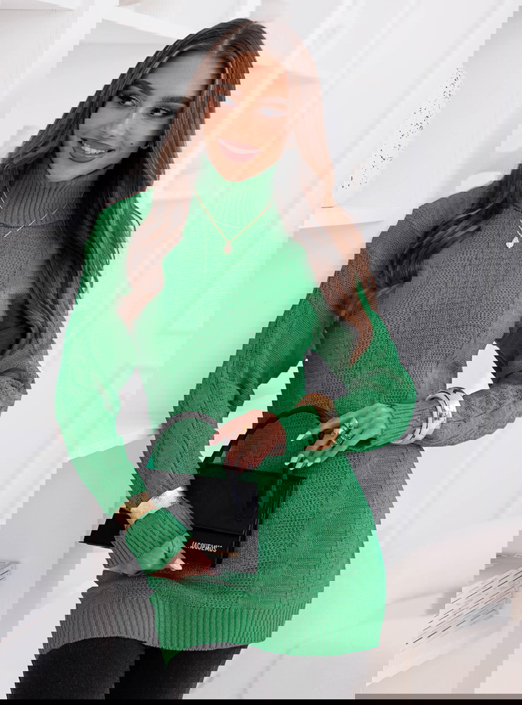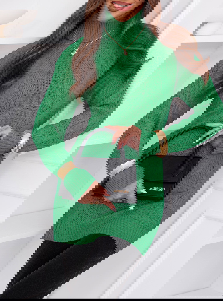 Zielony długi sweter z golfem Mirate to propozycja, która łączy w sobie świeżość koloru z klasyczną formą. Jego intensywny odcień ożywia każdą stylizację, wprowadzając nutę energii i nowoczesności. To model, który przyciąga uwagę, a jednocześnie pozostaje niezwykle uniwersalny. Dłuższy krój nadaje mu lekkości i elegancji, a wysoki golf otula szyję, zapewniając ciepło i komfort w chłodniejsze dni. Splot warkoczowy dodaje mu struktury i ciekawego wyrazu. Sweter łączy casualową wygodę z kobiecym urokiem, tworząc idealny balans między swobodą a stylem. To wybór dla kobiet, które lubią wyglądać modnie, nie rezygnując z wygody. Zielony kolor pięknie komponuje się z neutralnymi dodatkami, podkreślając urok jesienno-zimowych stylizacji. Ten sweter to doskonały sposób, by wyróżnić się w subtelny, elegancki sposób.