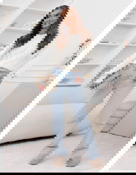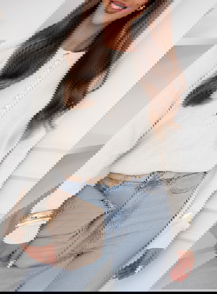 Sweter z guzikami Taurinaa - ecru to propozycja, która wprowadza do jesiennej garderoby lekkość, elegancję i subtelny urok. Jego jasny, delikatny odcień pięknie rozświetla stylizacje, dodając im świeżości nawet w pochmurne dni. Dekoracyjne guziki umieszczone wzdłuż dekoltu nadają całości wyjątkowego, kobiecego charakteru. Sweter ma przyjemnie swobodny krój, dzięki czemu prezentuje się naturalnie i komfortowo. Drobne wykończenia przy rękawach tworzą harmonijny, dopracowany efekt, który podkreśla jego stylowy wygląd. To model, który świetnie sprawdza się zarówno na co dzień, jak i w bardziej dopracowanych, jesiennych zestawach.