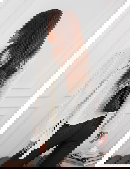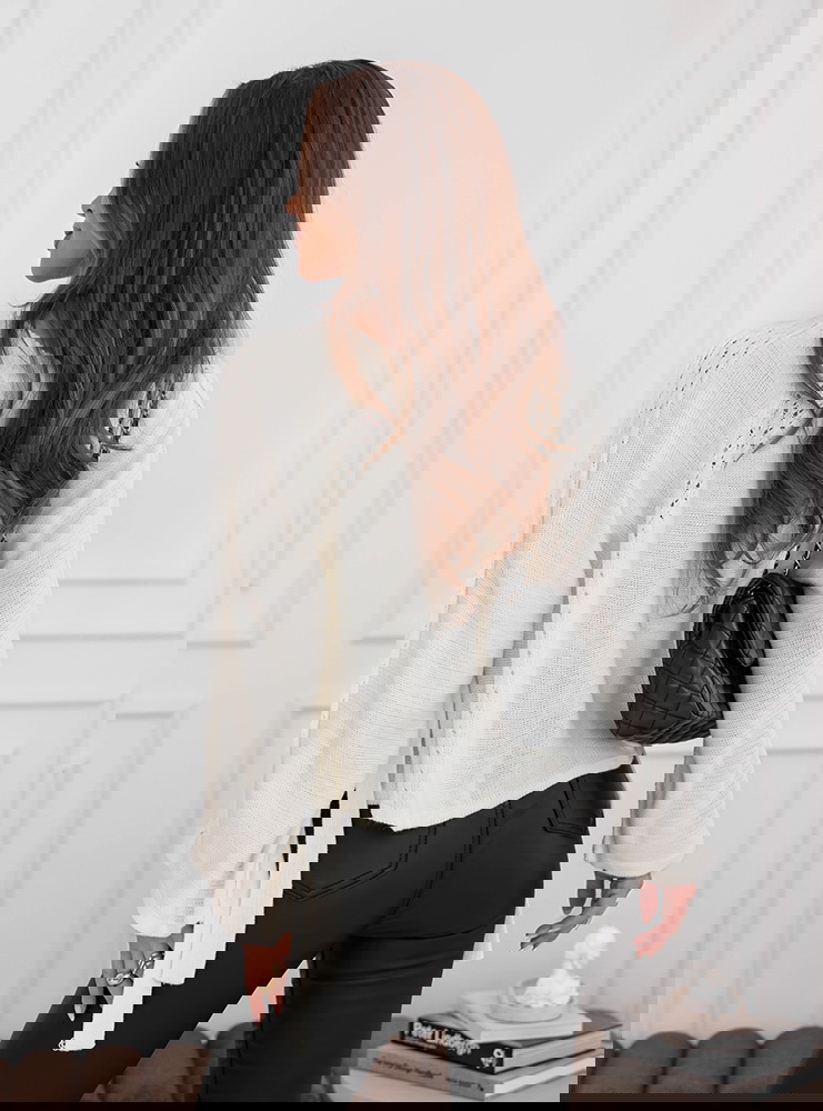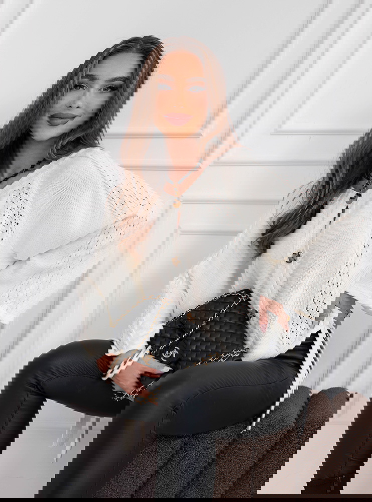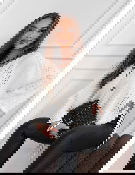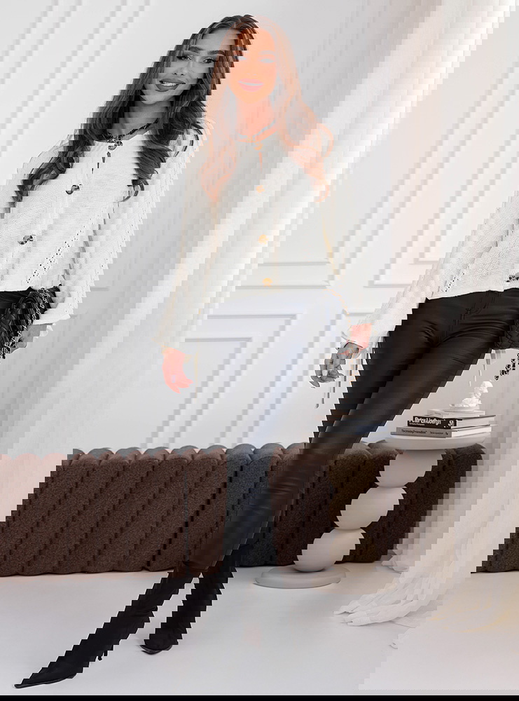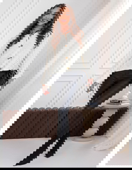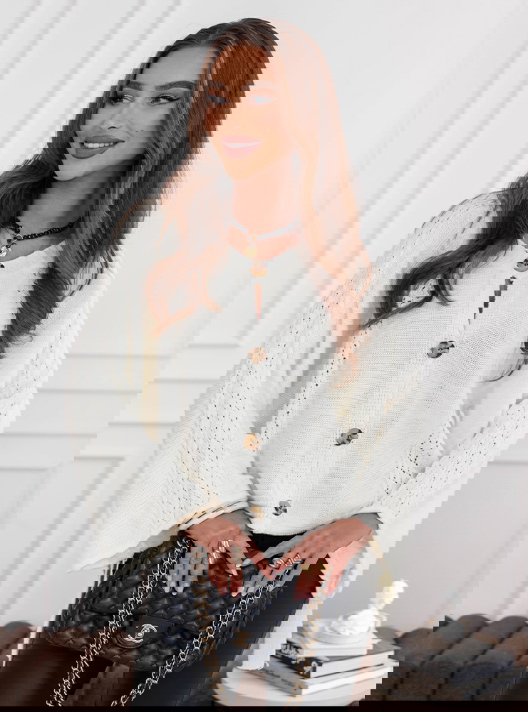 Sweter zapinany na guziki Dorena - ecru to idealne połączenie klasyki, kobiecości i wygody. To model, który od razu przyciąga uwagę subtelnym odcieniem i nowoczesnym fasonem. Jasny kolor ecru dodaje stylizacji lekkości i elegancji, sprawiając, że sweter świetnie wpisuje się w jesienno-zimowy klimat. Luźny, lekko oversize’owy krój zapewnia swobodę ruchów, a przy tym prezentuje się niezwykle stylowo. Guziki dodają mu charakteru i stanowią delikatny, modny akcent. Drobne ażurowe detale wzdłuż rękawów i boków nadają mu subtelności i lekkości. To model, który doskonale sprawdzi się w codziennych stylizacjach, zarówno w zestawieniu z jeansami, jak i eleganckimi spodniami. Sweter zachwyca swoją prostotą, ale jednocześnie ma w sobie coś wyjątkowego. W nim każda kobieta poczuje się komfortowo, modnie i kobieco.