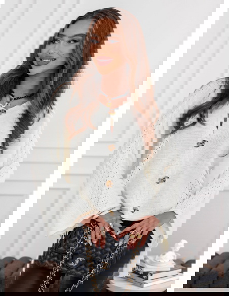 Sweter zapinany na guziki Dorena - ecru to propozycja, która łączy prostotę i elegancję w najlepszym wydaniu. Jego lekki fason, ozdobne guziki i subtelne detale sprawiają, że prezentuje się wyjątkowo stylowo.