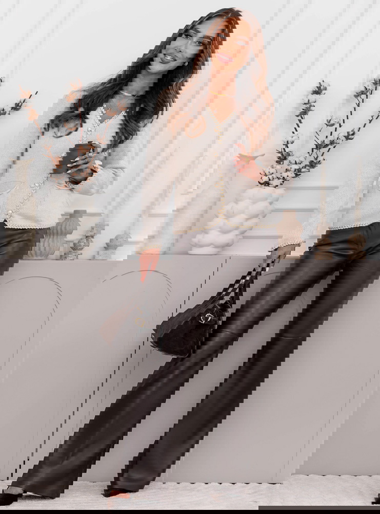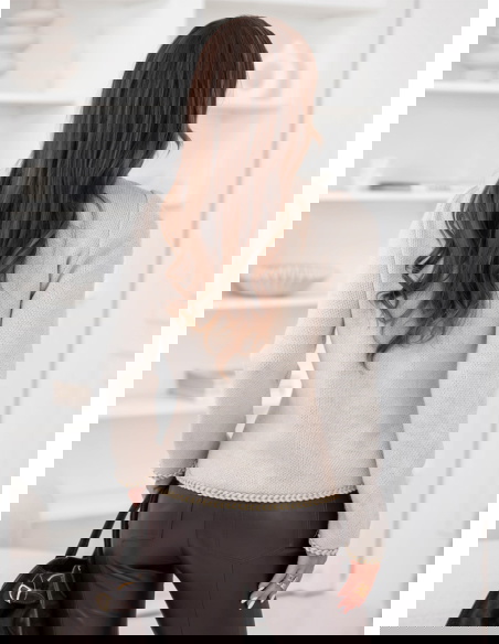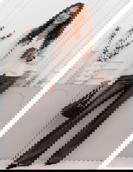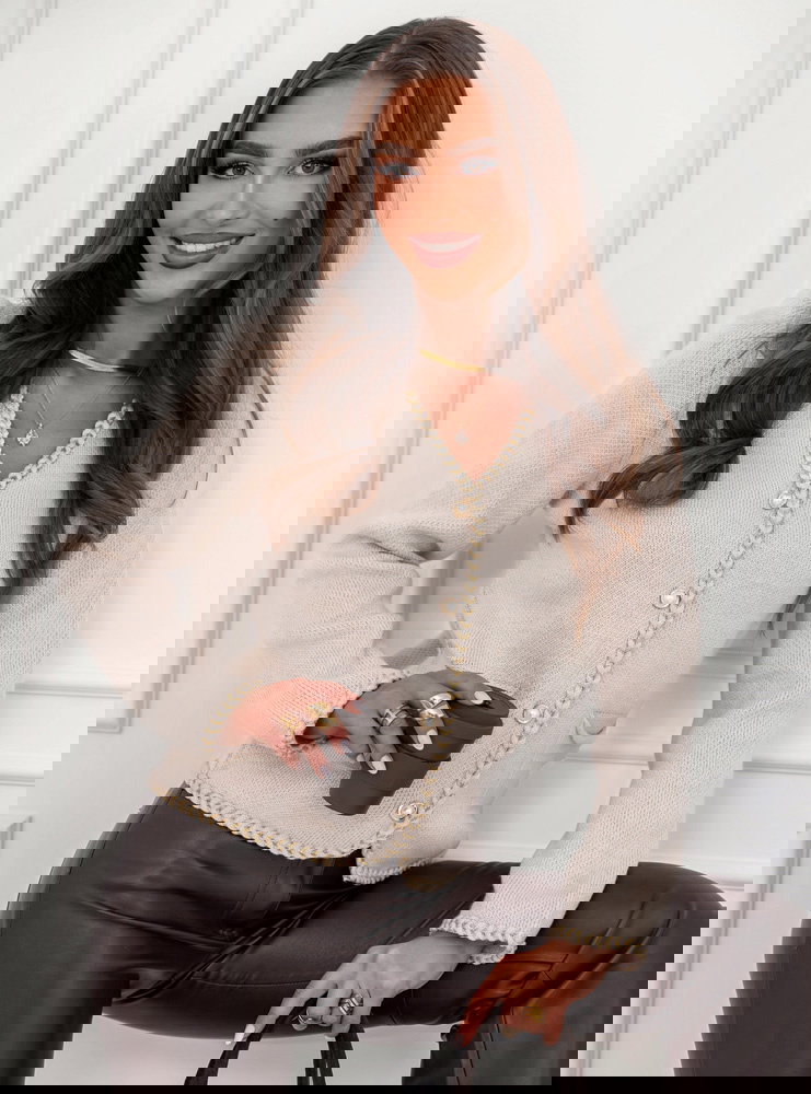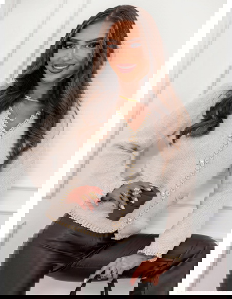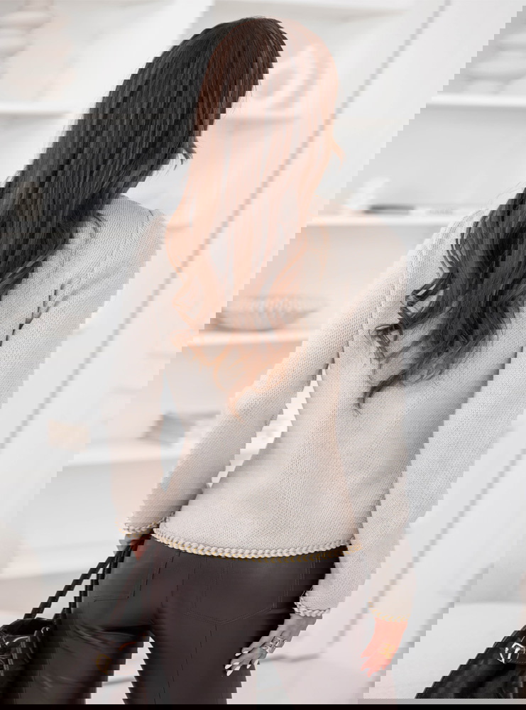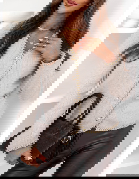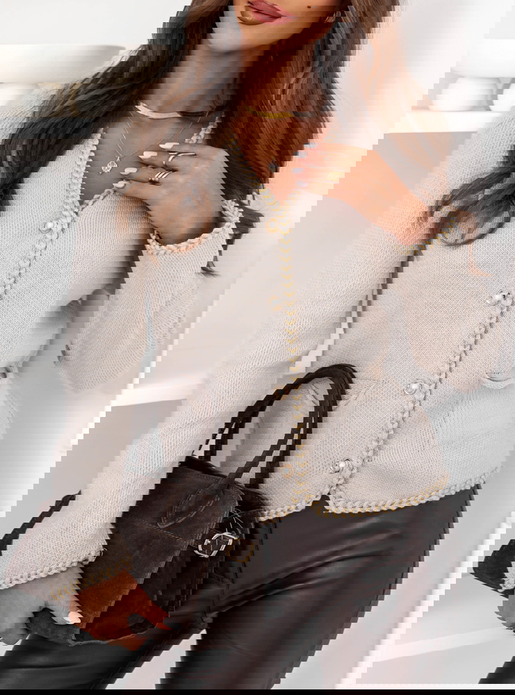 Beżowy sweter zapinany na guziki Latwina to propozycja, która idealnie wpisuje się w jesienne, delikatnie otulające klimaty. Już na pierwszy rzut oka zachwyca subtelnym kolorem, który pięknie harmonizuje z ciepłą aurą tego sezonu. Złote guziki dodają mu eleganckiego wykończenia, jednocześnie pozostając bardzo nienachalnym akcentem. Sweter ma kobiecy, lekko dopasowany krój, który podkreśla sylwetkę, ale pozostaje przy tym komfortowy. Dekoracyjne obszycia wzdłuż krawędzi nadają mu wyjątkowy charakter i sprawiają, że prezentuje się naprawdę stylowo. To model, który świetnie sprawdzi się na co dzień, ale również w bardziej dopracowanych, jesiennych stylizacjach.