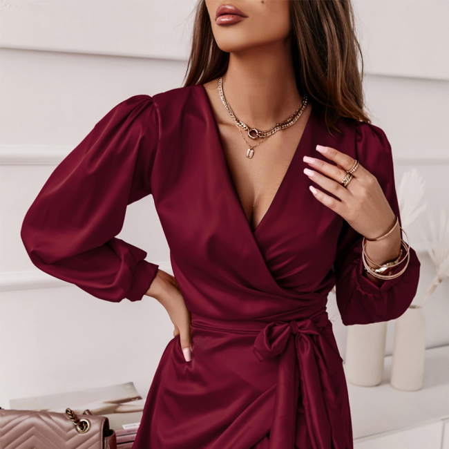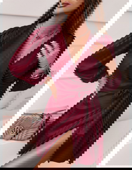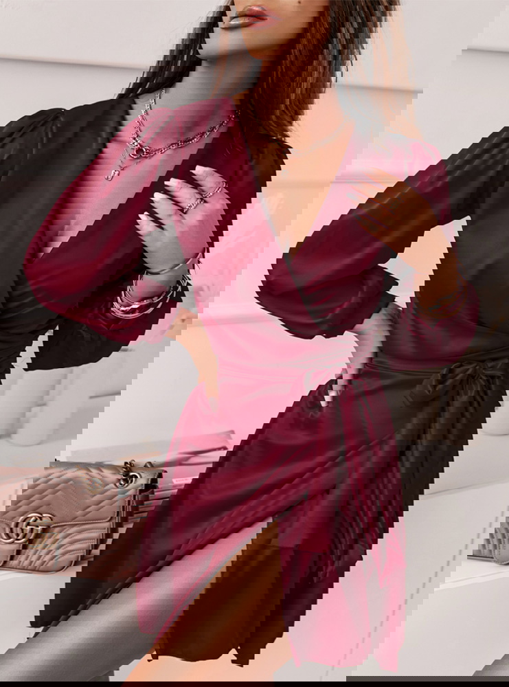 Bordowa satynowa sukienka przekładana z dekoltem Arelkiaa