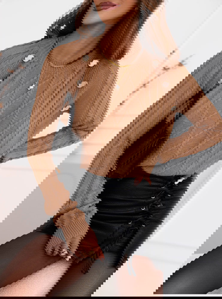 Sweter z ozdobnymi guzikami Rydia - mocha mousse to propozycja dla kobiet, które lubią, gdy klasyka spotyka się z modnym akcentem. Warkoczowy splot i ozdobne guziki tworzą duet, który nadaje mu wyjątkowego charakteru.
