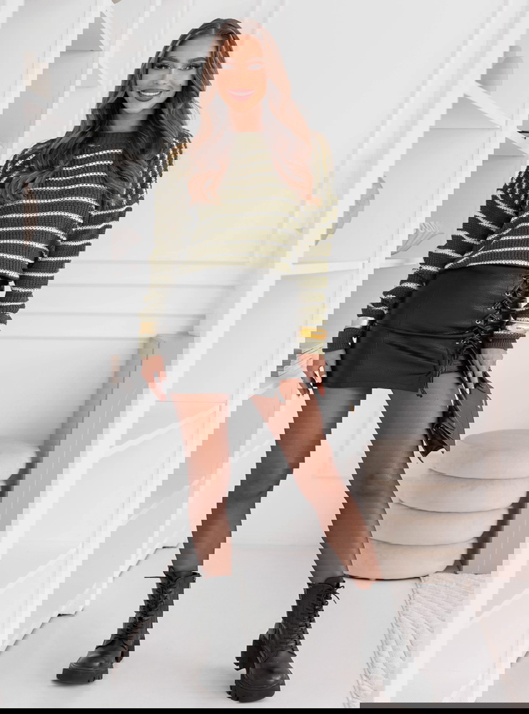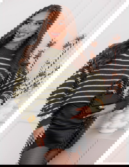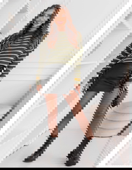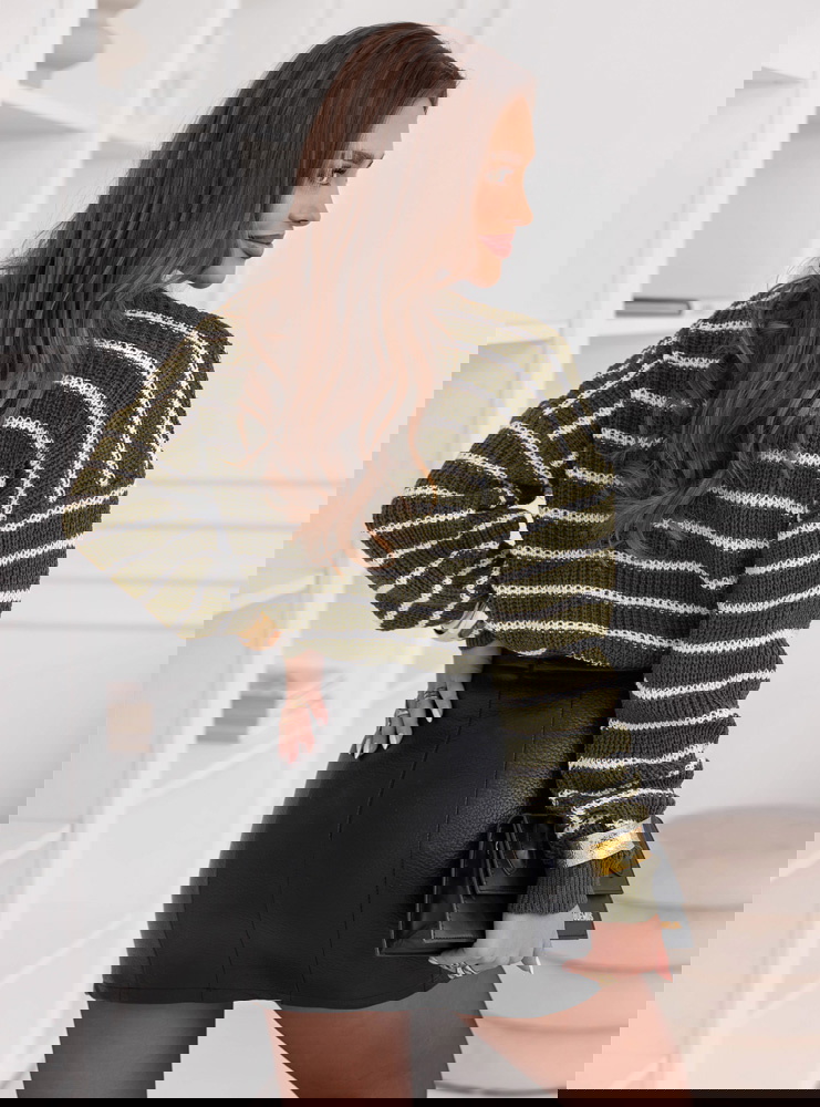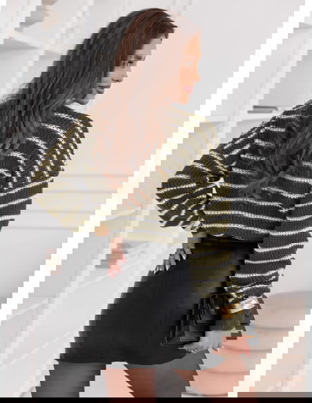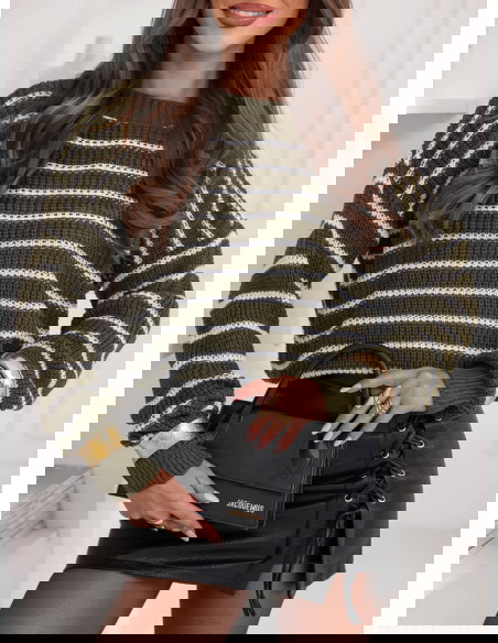 Sweter w paski Catheryn - khaki sprawdzi się doskonale w wielu sytuacjach – od codziennych wyjść, przez pracę, po spokojne weekendy. Świetnie wygląda w połączeniu z jeansami, skórzanymi spodniami lub spódnicą mini.