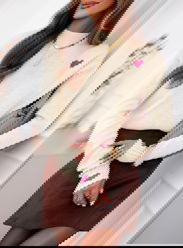 Sweter z serduszkami Mozelle - ecru to doskonały wybór dla kobiet, które cenią subtelne detale i ponadczasowy styl. Łączy w sobie delikatność, elegancję i wygodę.