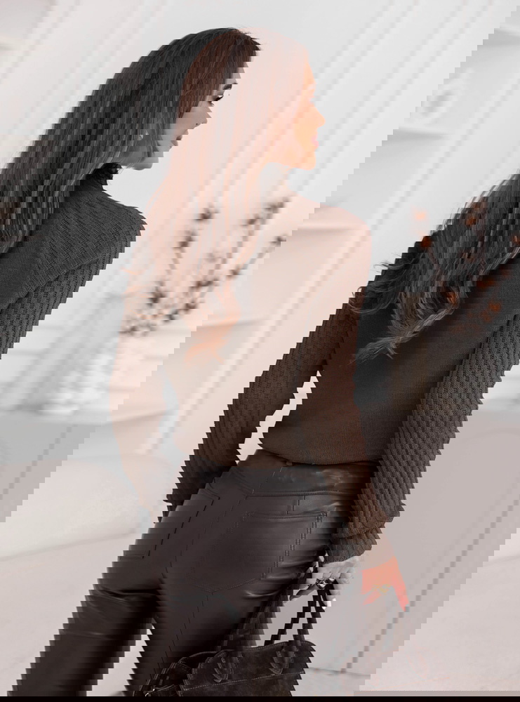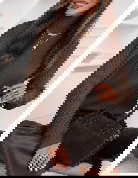 Czekoladowy sweter z golfem Delonnee to idealna propozycja na chłodniejsze dni, łącząca elegancję z nutą casualowego stylu. Jego głęboki, ciepły odcień brązu przyciąga wzrok i wprowadza do stylizacji jesienny klimat. To model, który zachwyca prostotą, a jednocześnie subtelnymi detalami nadającymi mu wyjątkowego charakteru. Wysoki golf otula szyję, zapewniając komfort i stylowy wygląd. Sweter pięknie układa się na sylwetce, delikatnie ją podkreślając, a zarazem nie krępując ruchów. Dłuższy fason nadaje mu uniwersalności — świetnie prezentuje się zarówno ze spodniami, jak i spódnicą. Klasyczny splot i dopracowane wykończenia podkreślają jego ponadczasowy charakter. To doskonały wybór dla kobiet, które cenią proste, a zarazem efektowne rozwiązania. W tym swetrze można poczuć się kobieco, stylowo i przytulnie – niezależnie od okazji.