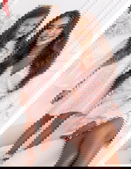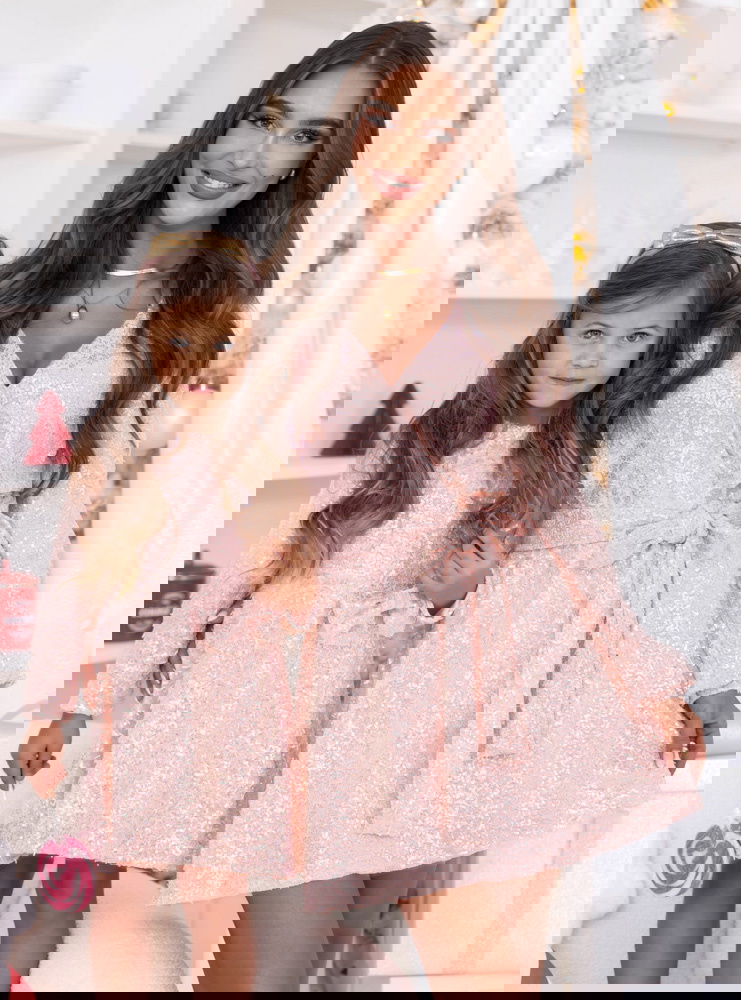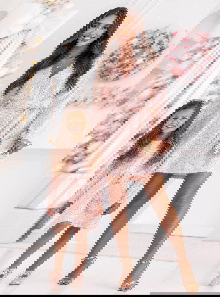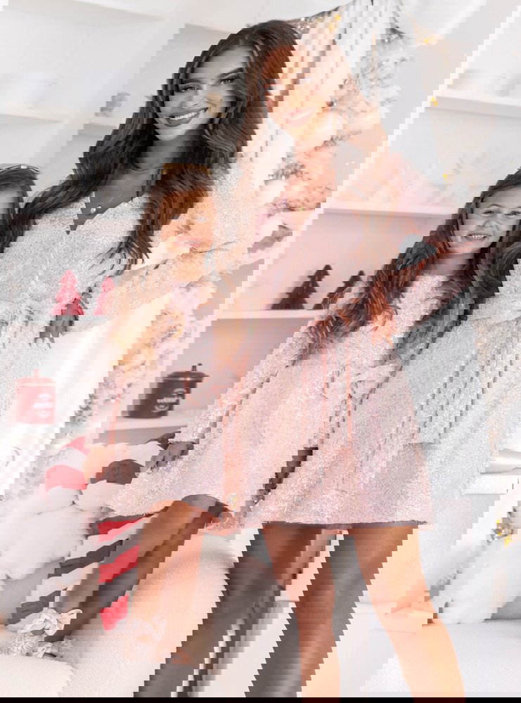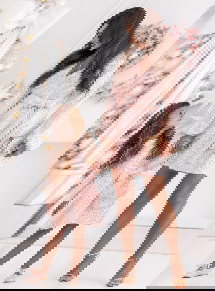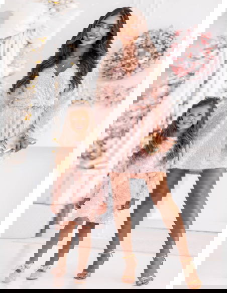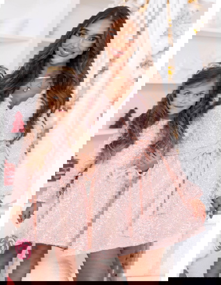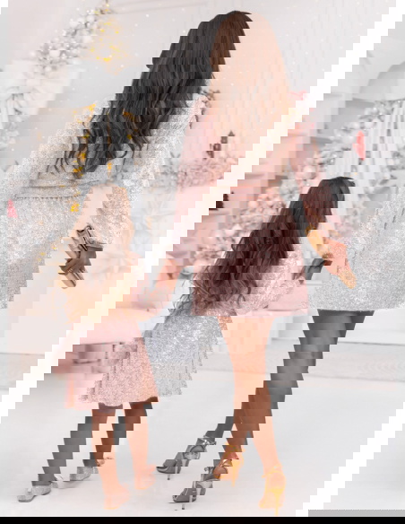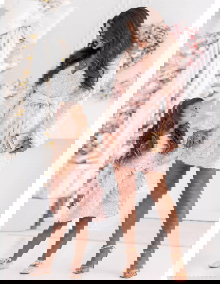Pudrowy zestaw cekinowych sukienek mama i córka Leonette to kwintesencja wspólnej elegancji i radości. Połyskujące tkaniny, subtelny krój i delikatny kolor sprawiają, że zestaw prezentuje się zjawiskowo.