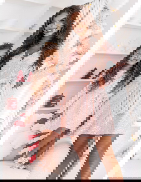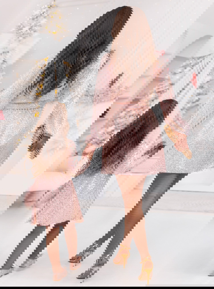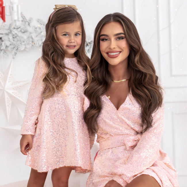 Pudrowy zestaw cekinowych sukienek świątecznych mama i córka Leonette -