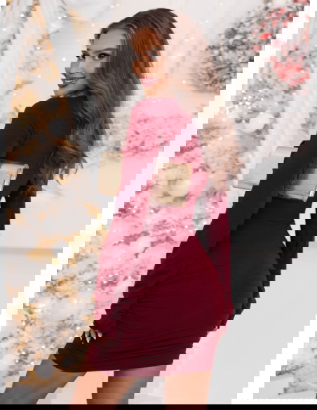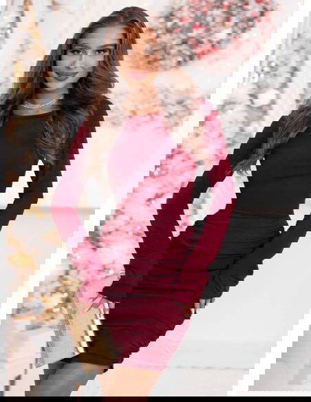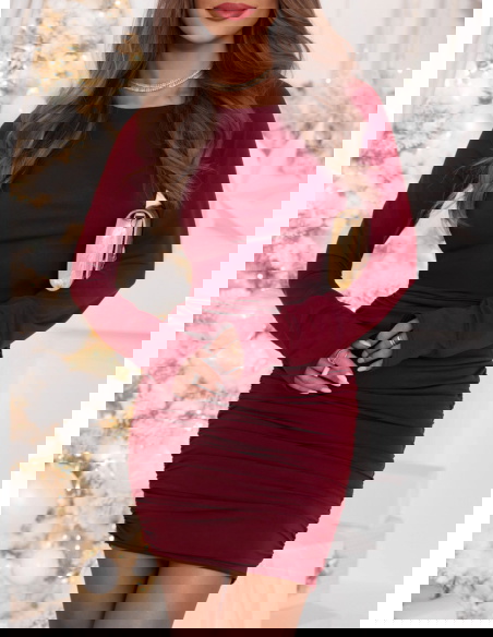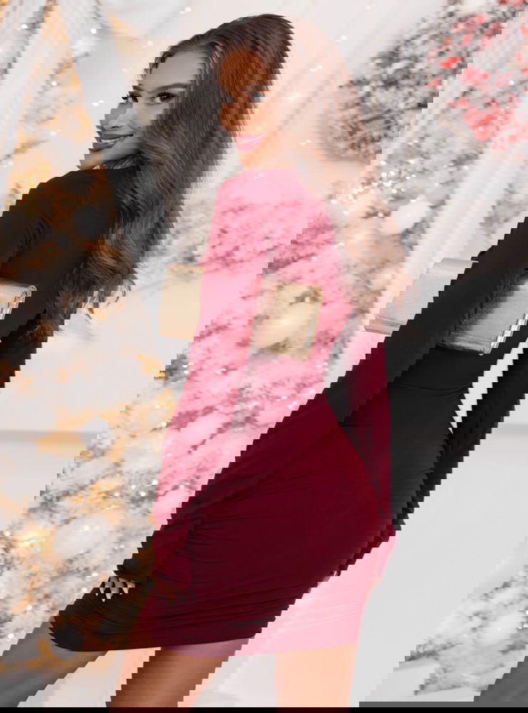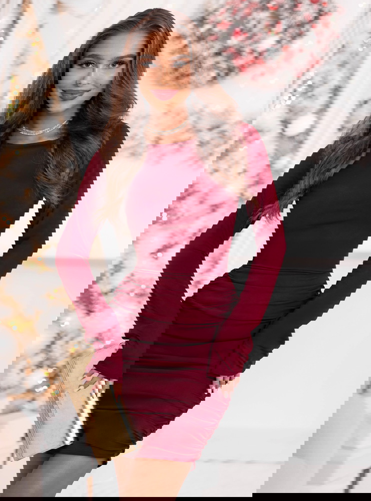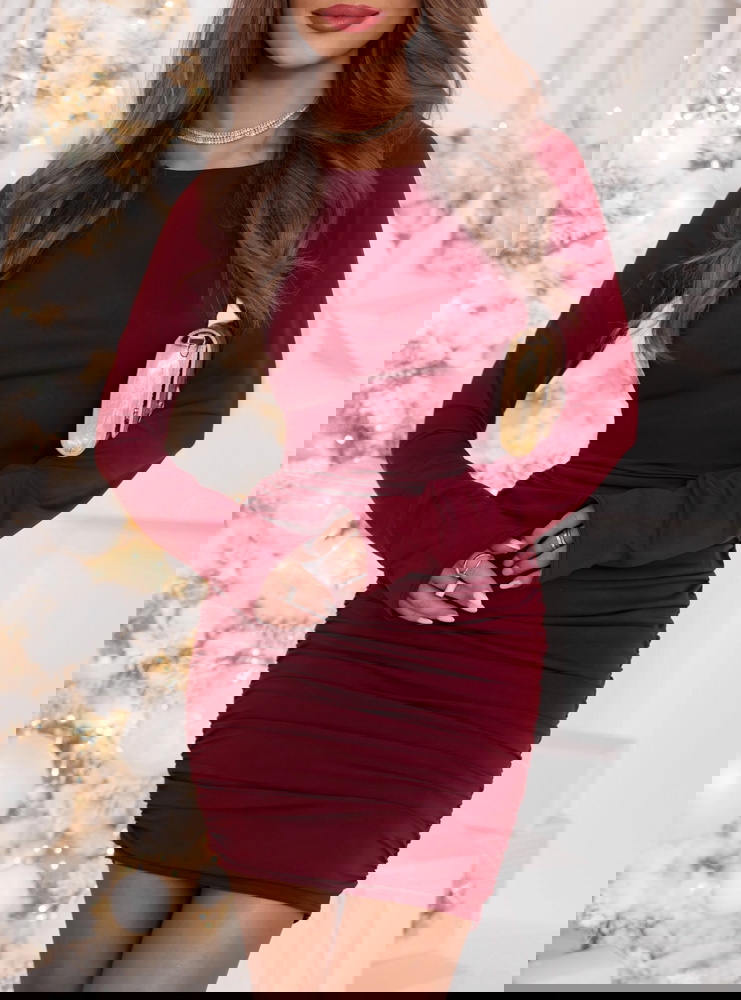 Bordowa świąteczna dopasowana sukienka mini z marszczeniami po bokach Kaytlan