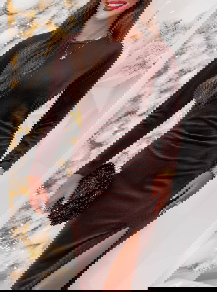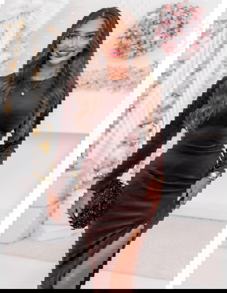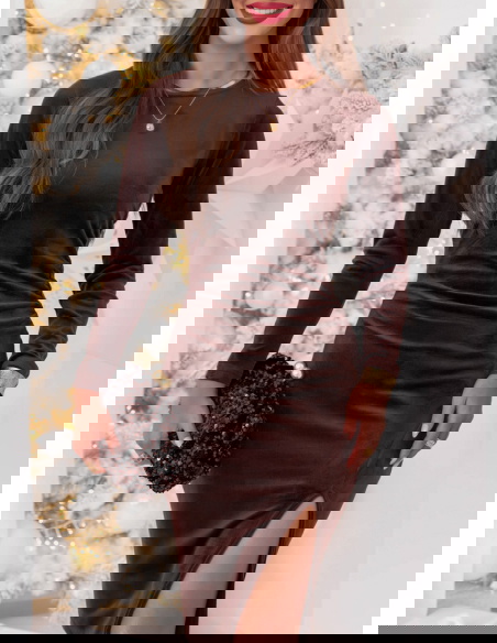 Czekoladowa welurowa dopasowana sukienka z rozcięciem na święta Claulota
