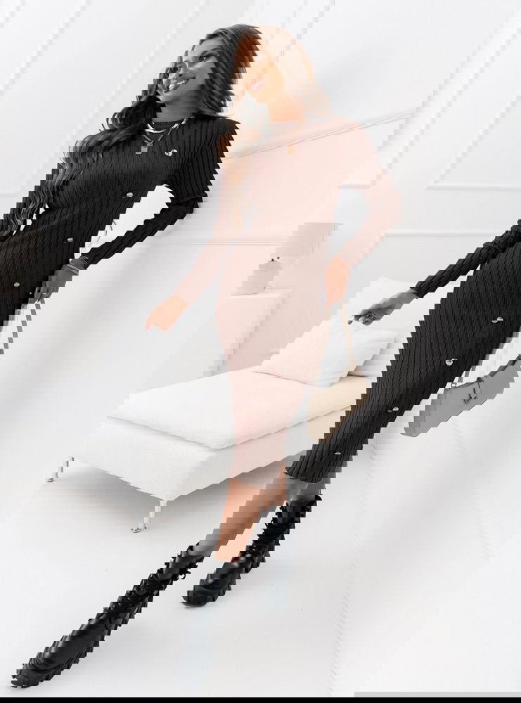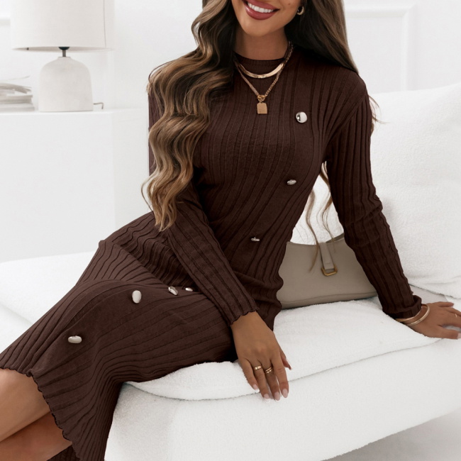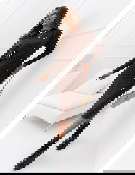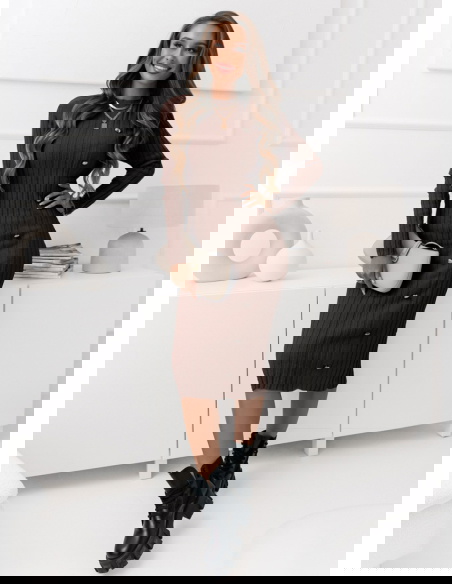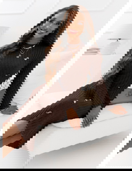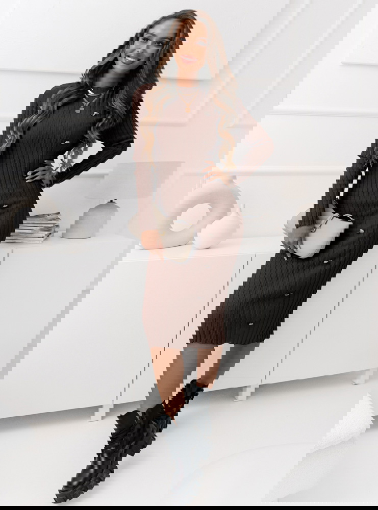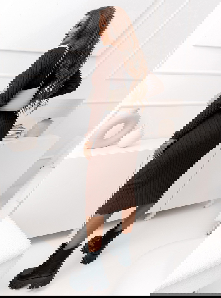 Czekoladowa sweterkowa prążkowana sukienka z ozdobnymi guzikami Daniella