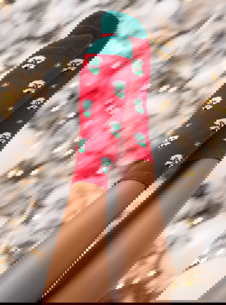 Świąteczne skarpetki damskie Jonte - wzór 16 to propozycja, która już od pierwszego spojrzenia wprowadza w ciepły, zimowy klimat. Ich intensywnie czerwony kolor pięknie współgra z uroczymi, białymi bałwankami, tworząc radosny i przyjemny efekt. Zielone akcenty dodają całości świeżości i świątecznego charakteru. Delikatne wzorki przypominające śnieżynki sprawiają, że skarpetki wyglądają wyjątkowo uroczo. To dodatek, który świetnie podkreśla zimową aurę i dodaje stylizacjom lekkości oraz odrobiny świątecznej magii.