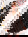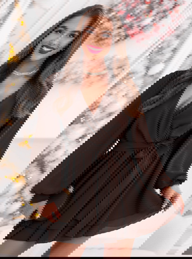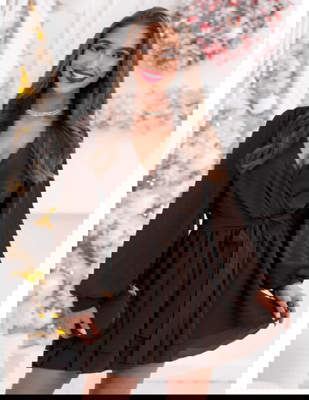 Czekoladowa szyfonowa sukienka mini na święta z przekładanym dekoltem Demaree