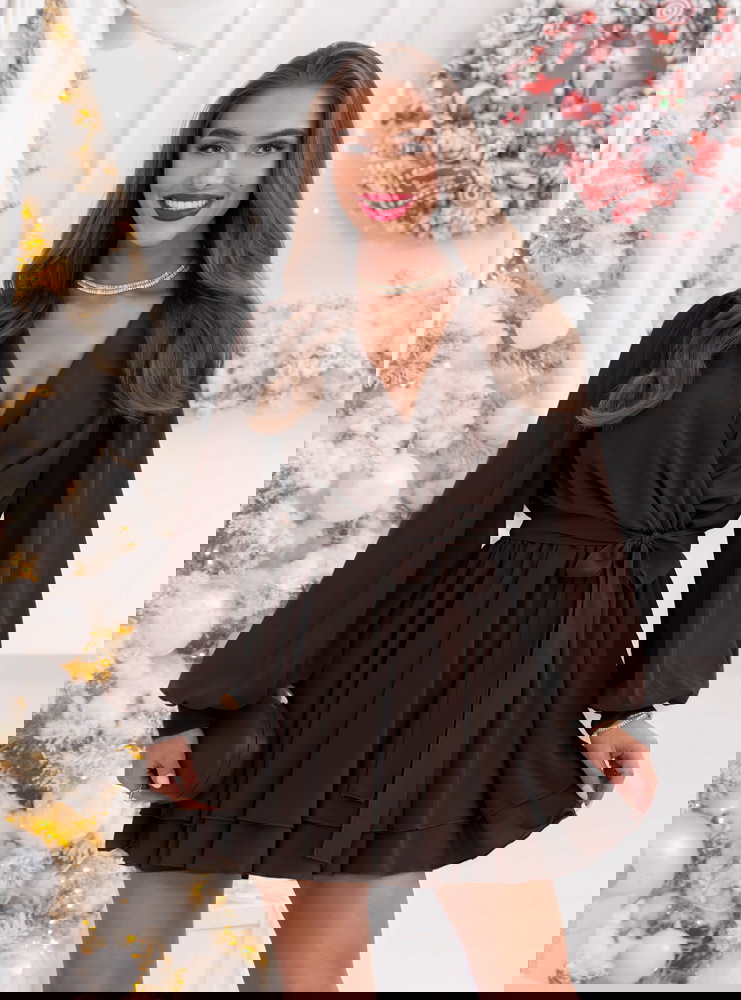 Czekoladowa szyfonowa sukienka mini z przekładanym dekoltem Demaree to idealny wybór na świąteczne kolacje, zimowe przyjęcia czy romantyczne spotkania. Świetnie sprawdzi się również podczas rodzinnych uroczystości lub wieczornych wyjść.