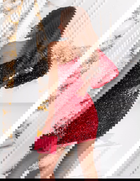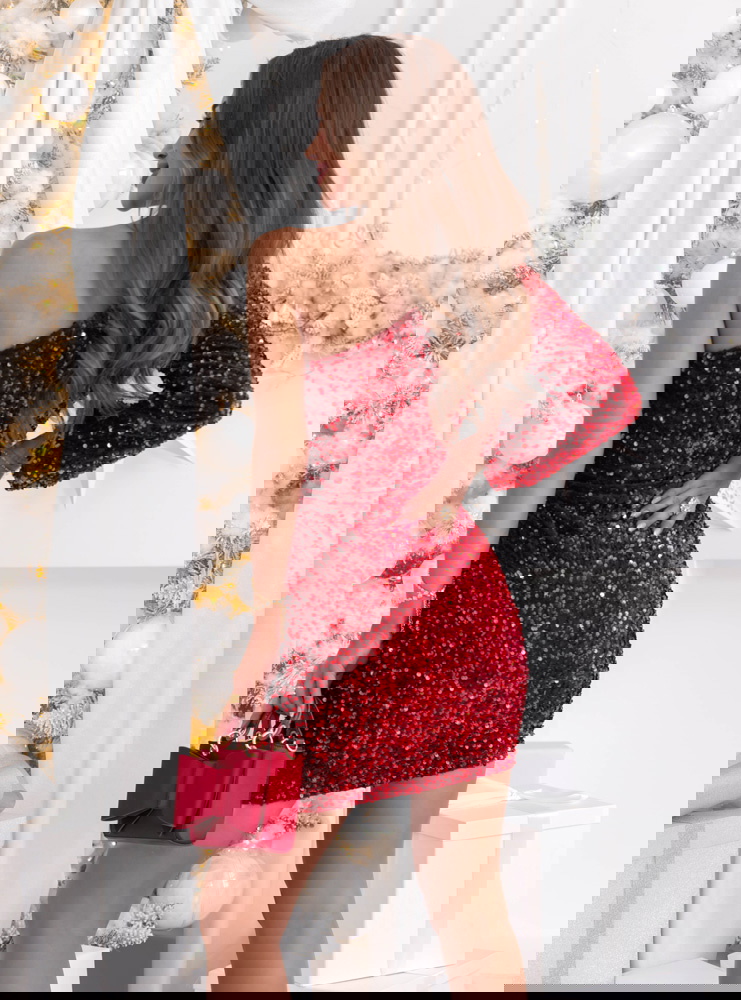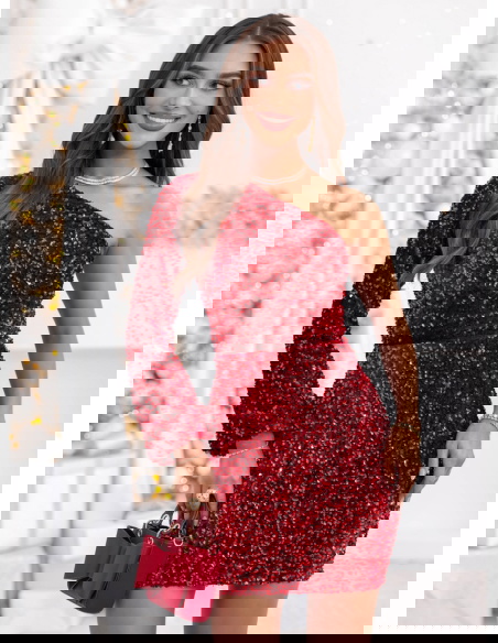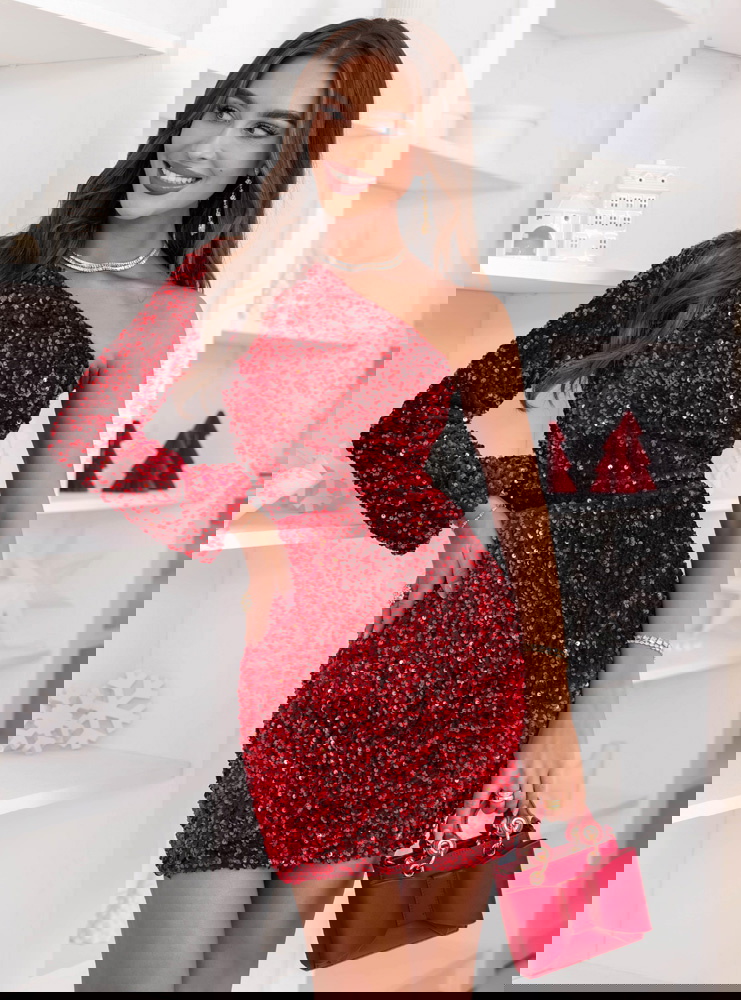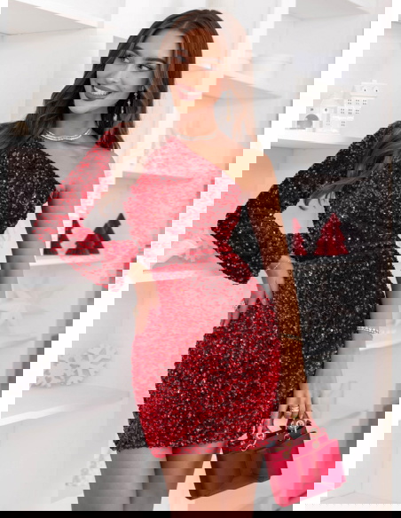 Malinowa cekinowa sukienka świąteczna na jedno ramię Chelsee